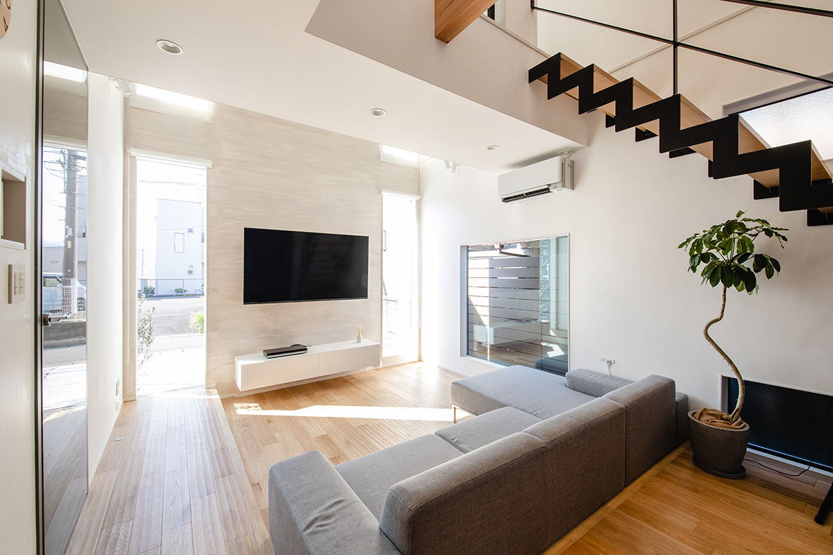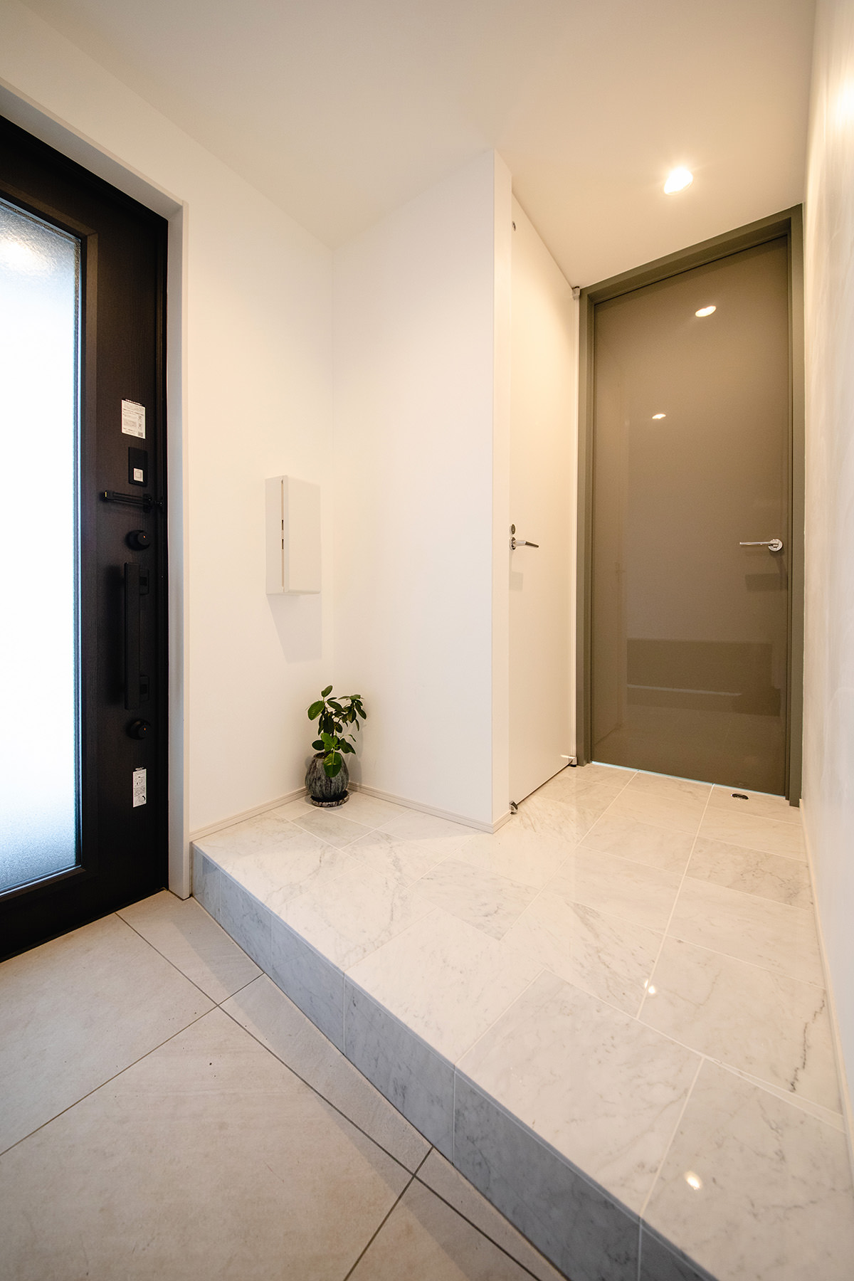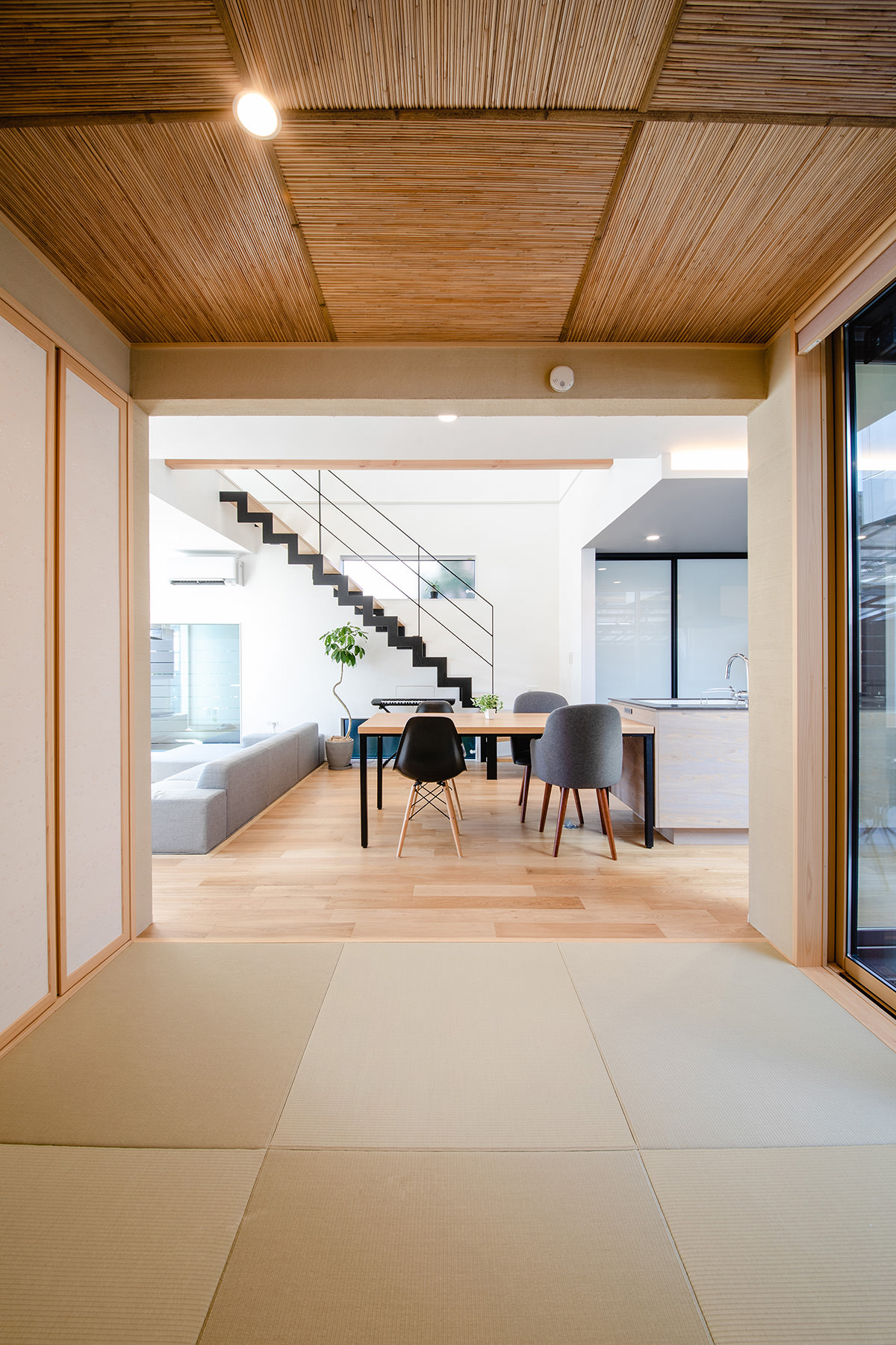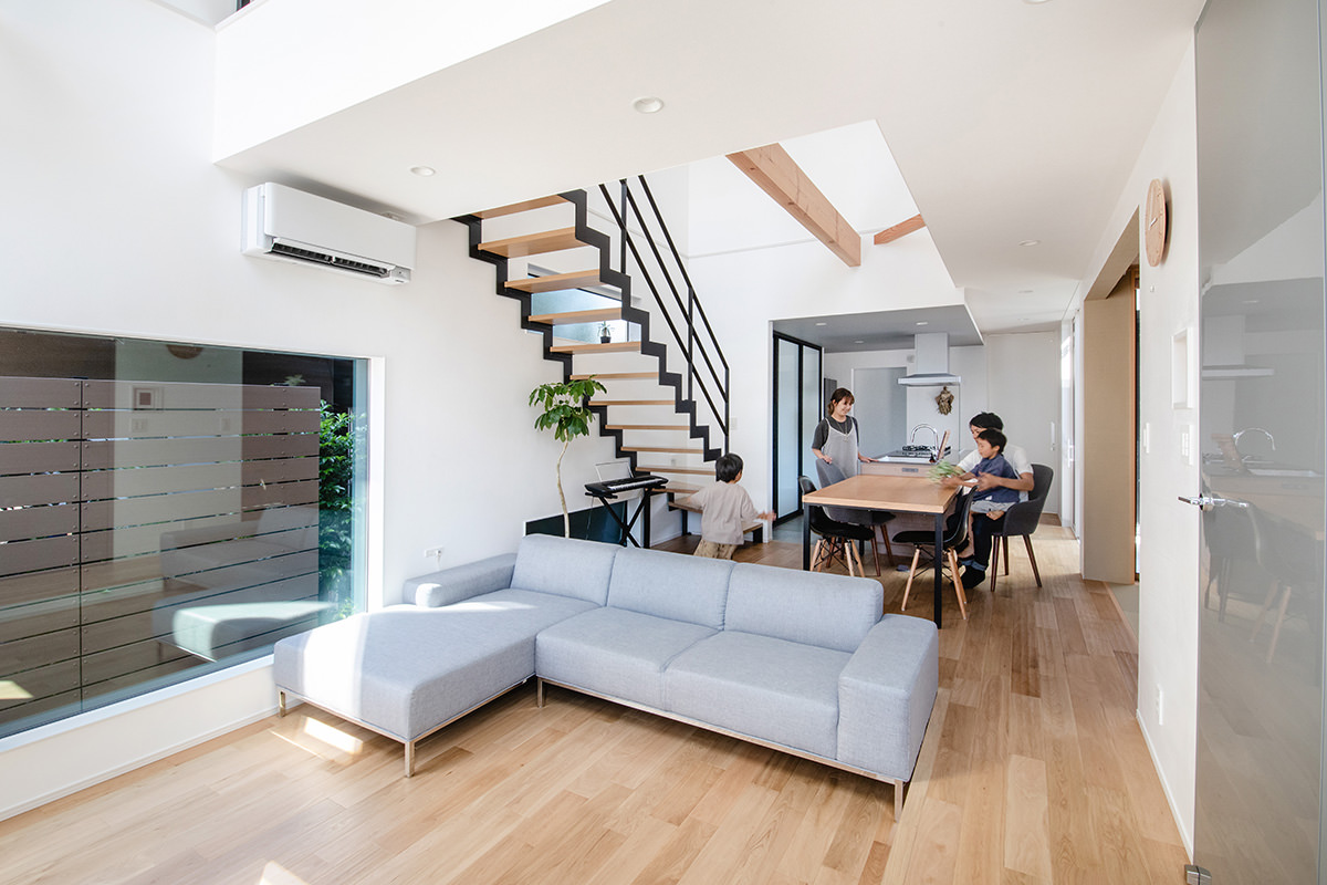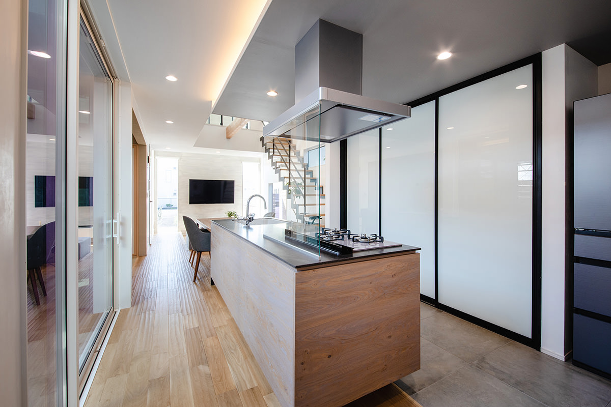 ARC style GALLERY コンシェルジュが家族への想いを描いた、温もりと優しさが同居する家 静岡県 Concept ダークグレーに木目のアクセントが映える外観。玄関脇に家族のシンボルツリーを添えました。北向きとは思えない開放感と明るさに満ちあふれたリビングは、天井まで続く大きな吹き抜けとイタリア製の塗り壁ユーロスタッコが空間を贅沢に彩ります。上部が吹き抜けになっていていつでも明るいダイニングは、キッチンの木の温もりと優しく繋がり、LDKの中心に位置する家族の集いの場に。 どこにいても家族の気配を感じられるよう、全体につながりのあるデザインの邸宅です。