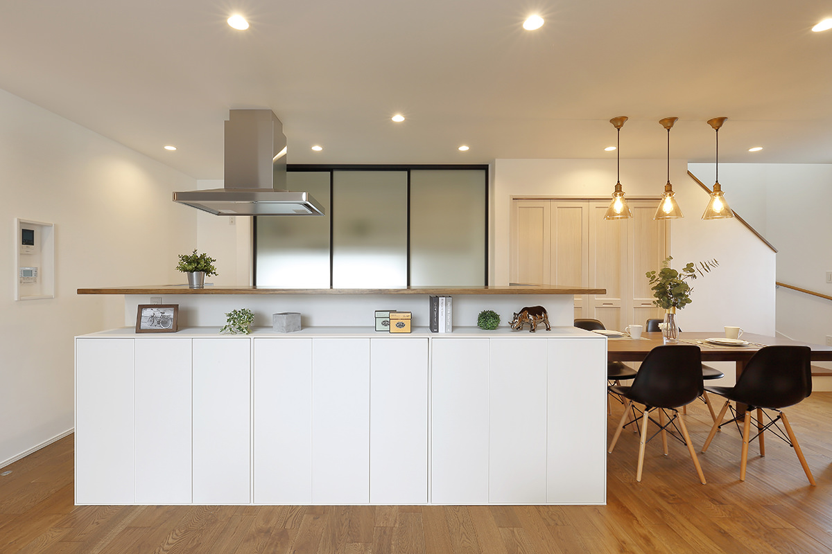 L字型に配置したLDKには、ダイニングの向こうの壁に電話やパソコンを置ける造作のカウンターデスクをつくりました。
