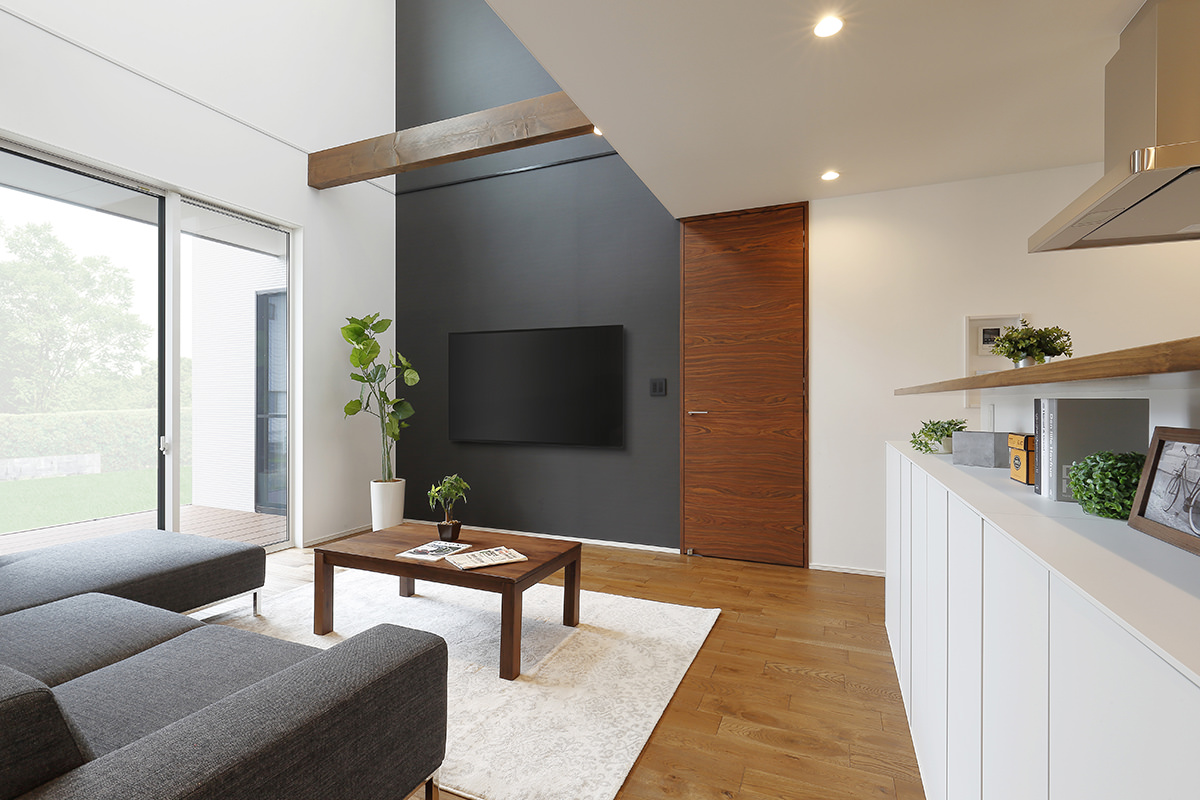 ダークグレーのアクセントウォールと、美しい木目のハイドアのコントラストが美しいリビング。
