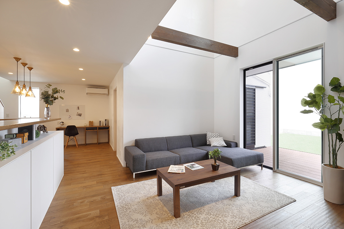 お庭側に設けたウッドデッキが、LDKに心地いい光と開放感をもたらします。