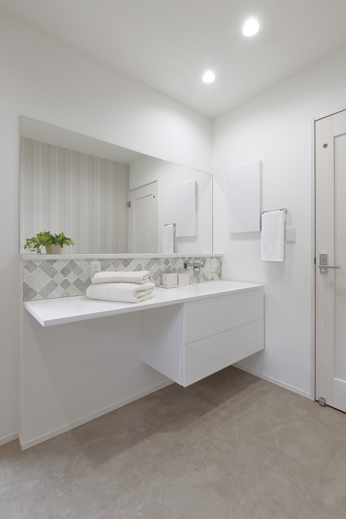 真っ白な洗面カウンターには、お気に入りのタイルを合わせてオシャレ感をプラスしました。