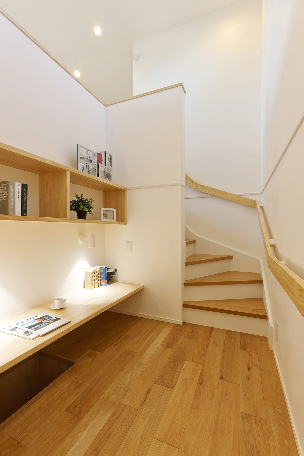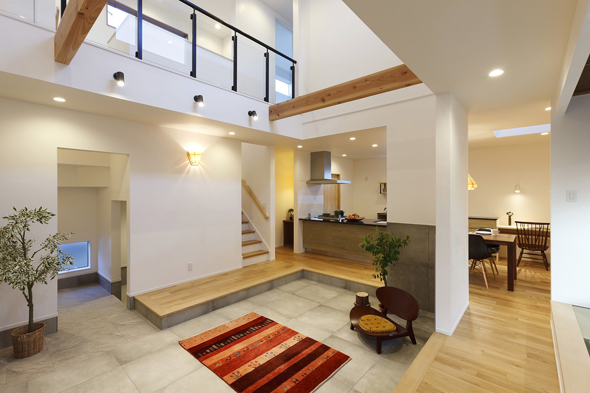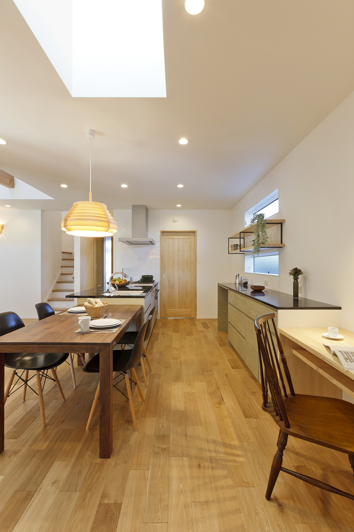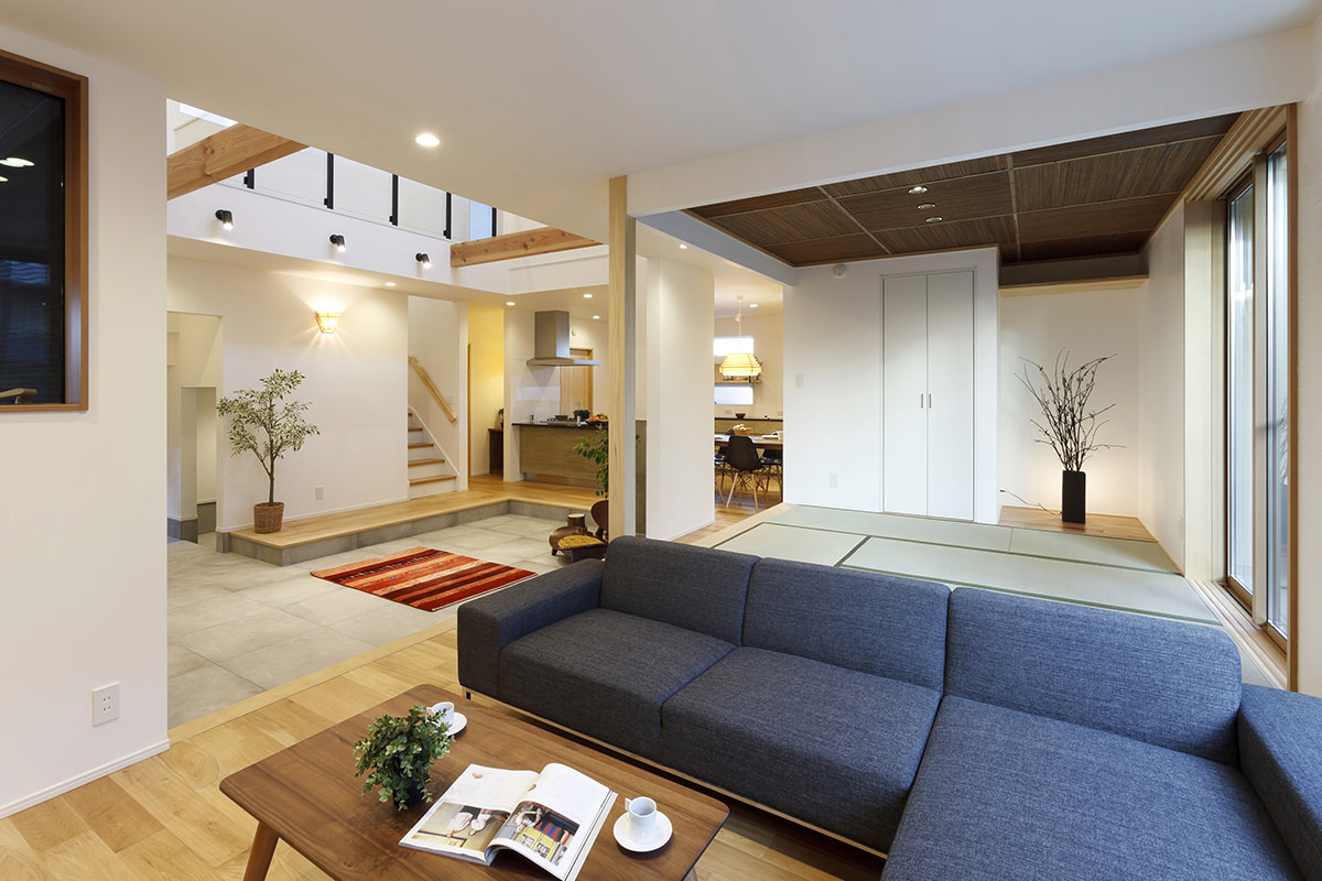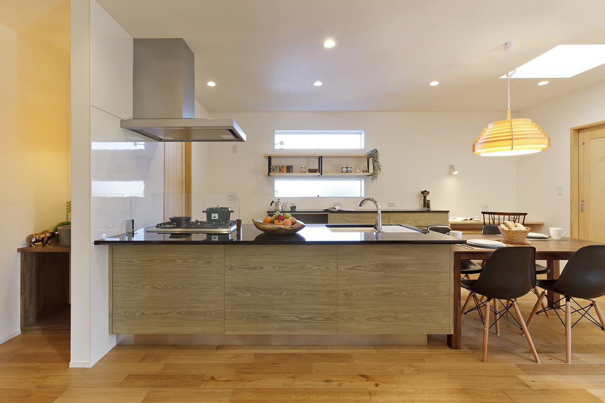 ARC style GALLERY 暖炉のある土間でくつろぐ、スローライフの家 静岡県 Concept 大きな切妻屋根はこの家のシンボル。土地の形状を活かし、勝手口から出入りできるカーポートを設けました。天窓から光が注ぐ、明るいダイニングキッチン。夜はお気に入りのヤコブソンランプが灯り、日中とはまた異なる時間を楽しめます。カップボードの横にちょっとした家事をこなせる手仕事カウンターをつくり、お気に入りの椅子でコーディネートしました。雨風を気にせずに出入りができる、ゆったりとした玄関ポーチ。向かいには和の趣を楽しめる格子のデザインを取り入れました。 できるだけ壁をなくしたLDK+和室+土間の大空間。ゆったりとした開放感に包まれつつ、それぞれの異なる空間を楽しめる邸宅です。