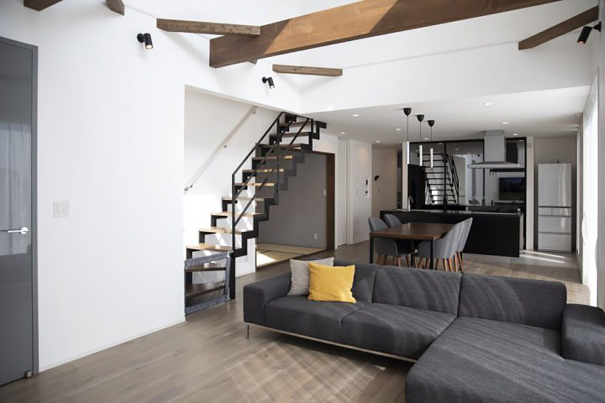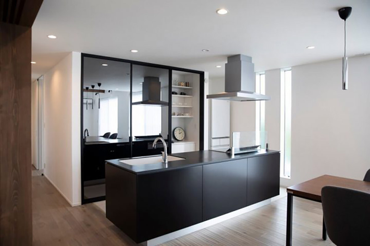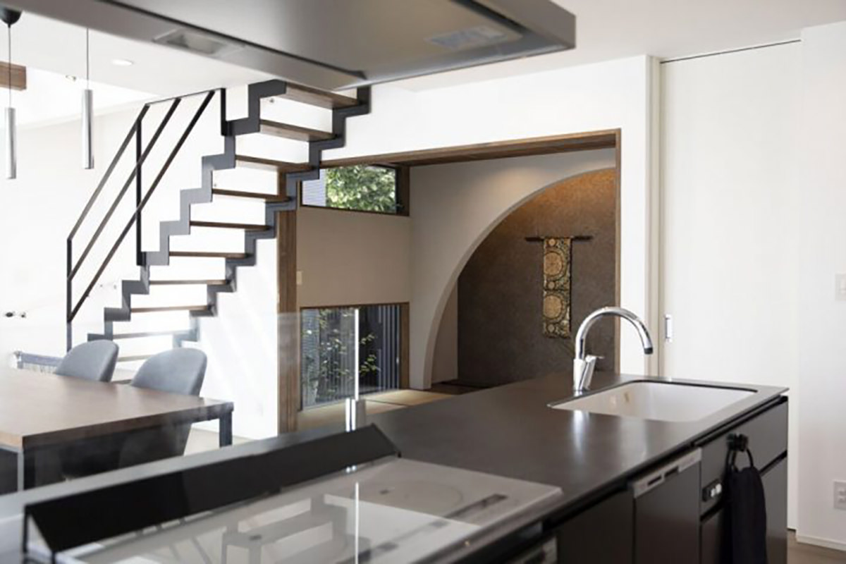 ARC style GALLERY 富士山麓に広がるグレー×Woodyな格好いい和モダン 静岡県 Concept 周囲の豊かな自然とマッチした、グレー基調の外観。キッチンもダイニングも白と黒のモノトーンでクールに仕上げています。それぞれ広めに余裕を持たせて設計することで開放的で居心地の良い空間が生まれました。また、キッチンの後ろ側には大容量の収納スペースを設け、その扉を鏡張りに。この鏡にリビングが映ることで、より空間を広く感じます。2階建てのメリットである吹き抜け仕様を最大限活用。玄関ホールやリビングを吹き抜けにし、ゆとりのある明るく開放的な空間が実現しました。