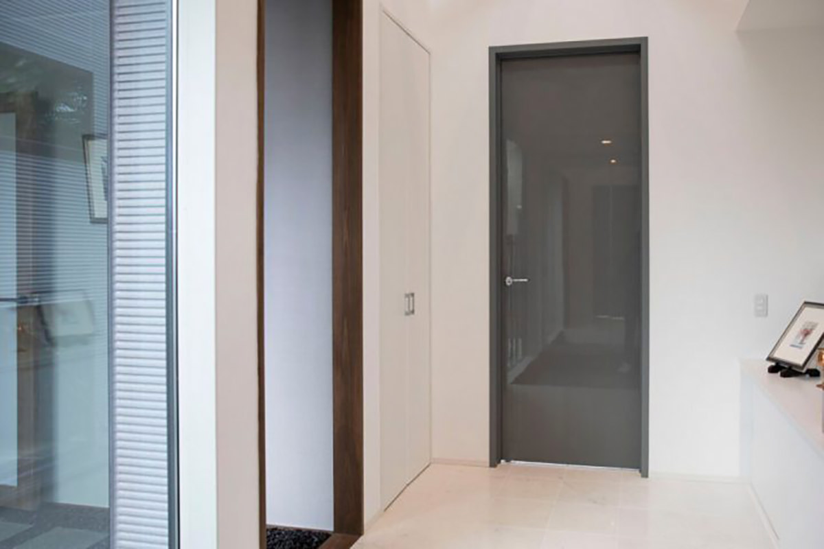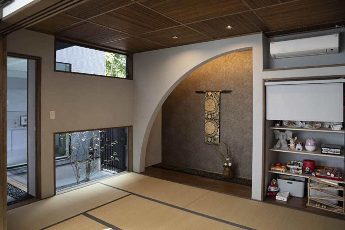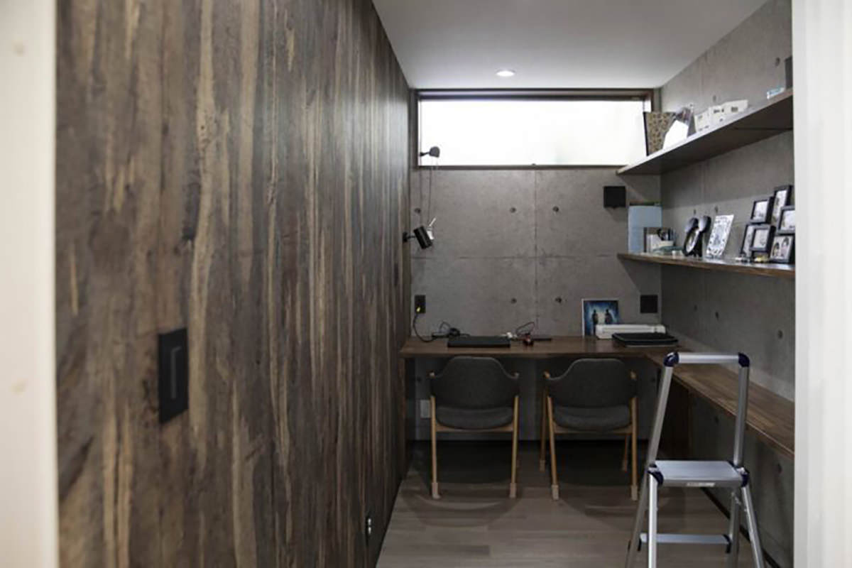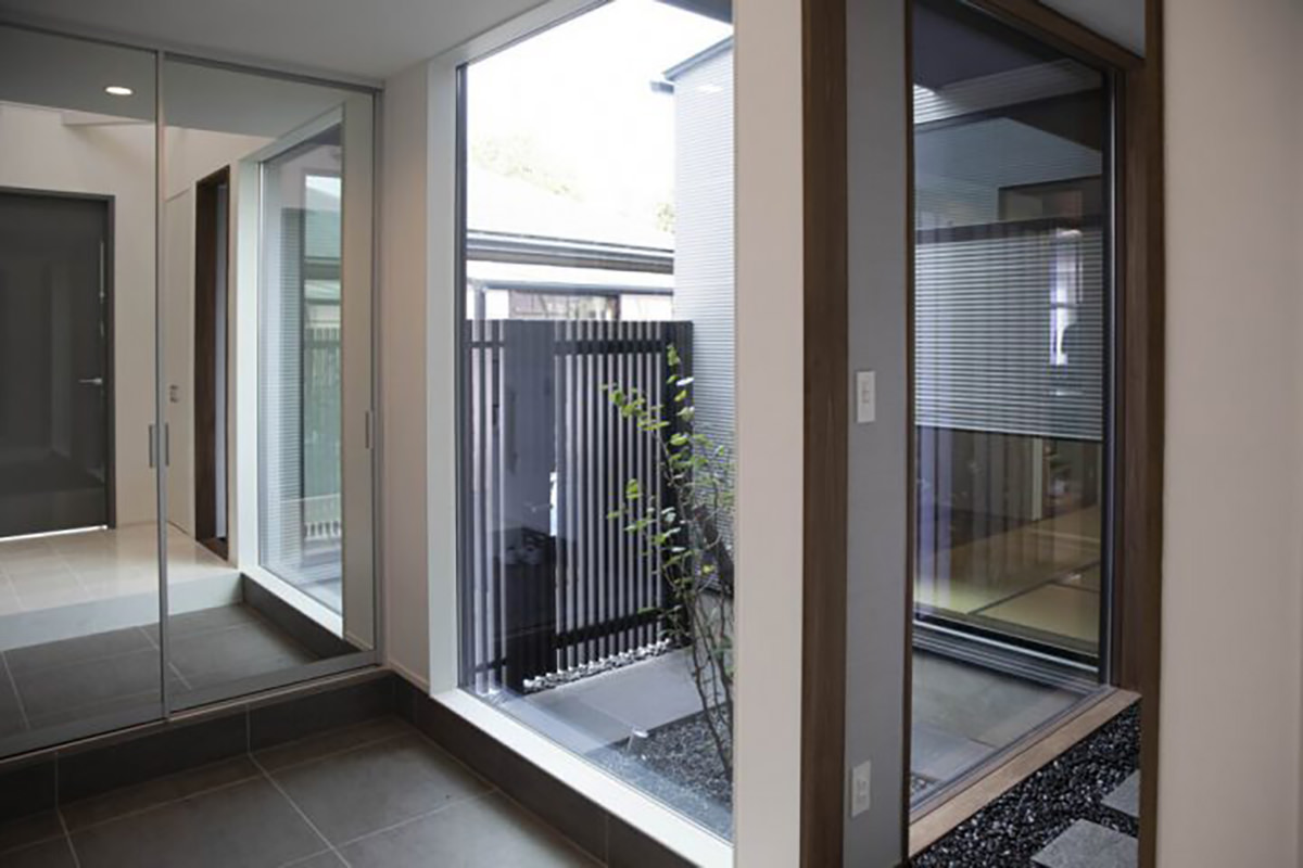 ARC style GALLERY 富士山麓に広がるグレー×Woodyな格好いい和モダン 静岡県 Concept 周囲の豊かな自然とマッチした、グレー基調の外観。キッチンもダイニングも白と黒のモノトーンでクールに仕上げています。それぞれ広めに余裕を持たせて設計することで開放的で居心地の良い空間が生まれました。また、キッチンの後ろ側には大容量の収納スペースを設け、その扉を鏡張りに。この鏡にリビングが映ることで、より空間を広く感じます。2階建てのメリットである吹き抜け仕様を最大限活用。玄関ホールやリビングを吹き抜けにし、ゆとりのある明るく開放的な空間が実現しました。