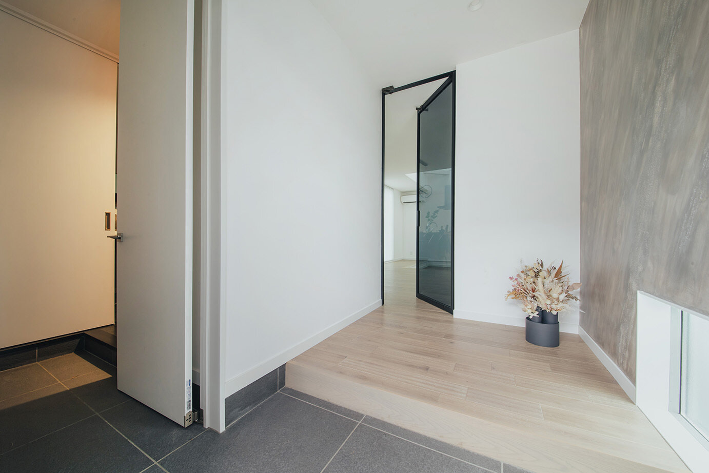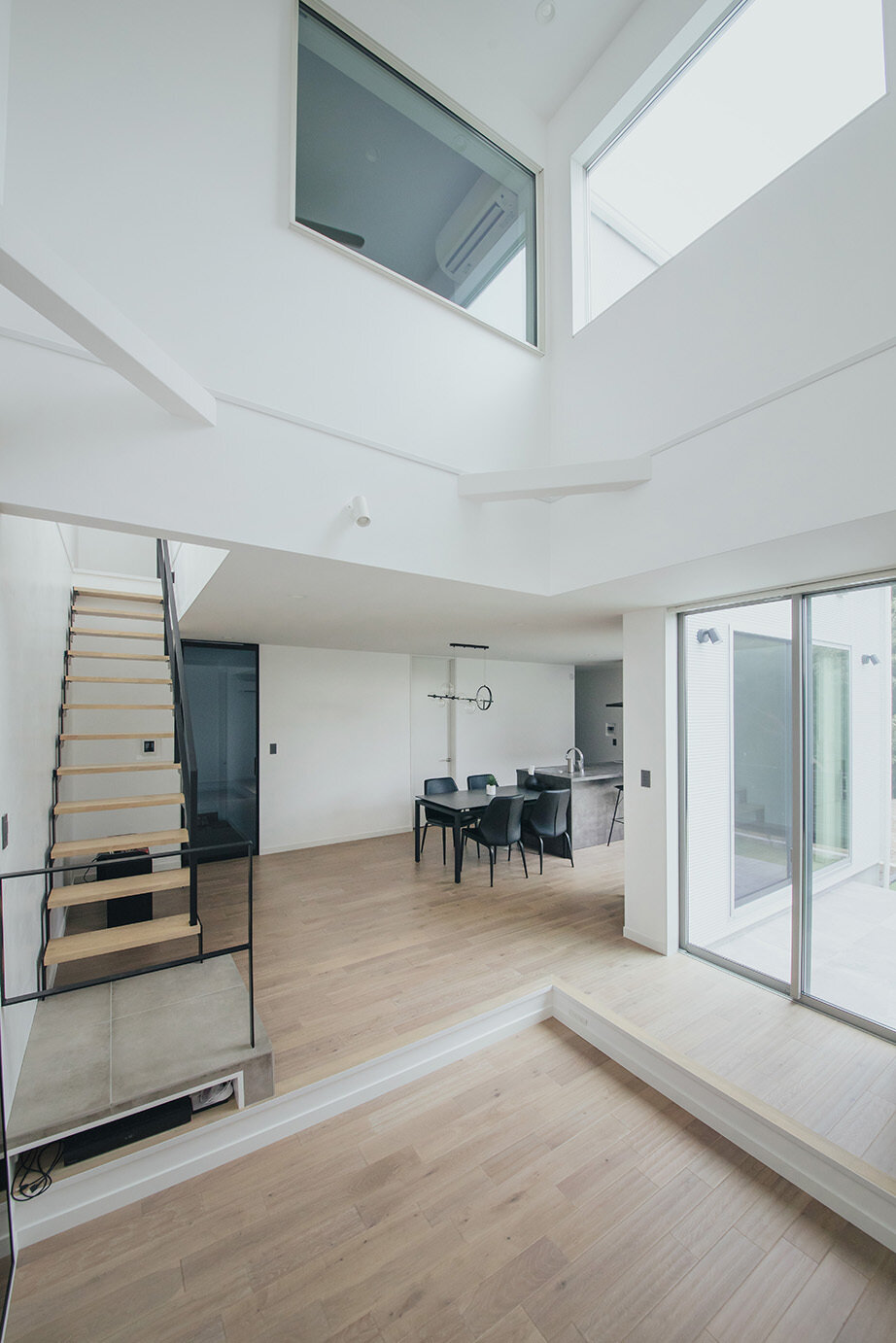 ARC style GALLERY シンプル&エレガントな空間で、ミニマルな暮らしを楽しむ家 静岡県富士宮市 Concept ミニマリストだからこそ「シンプル」を追求したLDK。白い漆喰壁や無垢床の心地良さを最大限に引き出しています。扉やカーテンを天井高に揃えることで、さらに美しい仕上がりに。白い箱を重ねたように見える、スタイリッシュな印象のT邸。周囲に黒い外壁の家が多く、あえて白い外壁を選びました。クローズドな外観デザインからは、室内の圧倒的な開放感が想像できないほど。大容量のソーラーパネルも搭載され、ランニングコストを抑えた低燃費な暮らしを叶えます。シンプル&エレガントな空間で、ミニマルな暮らしを楽しむ邸宅です。