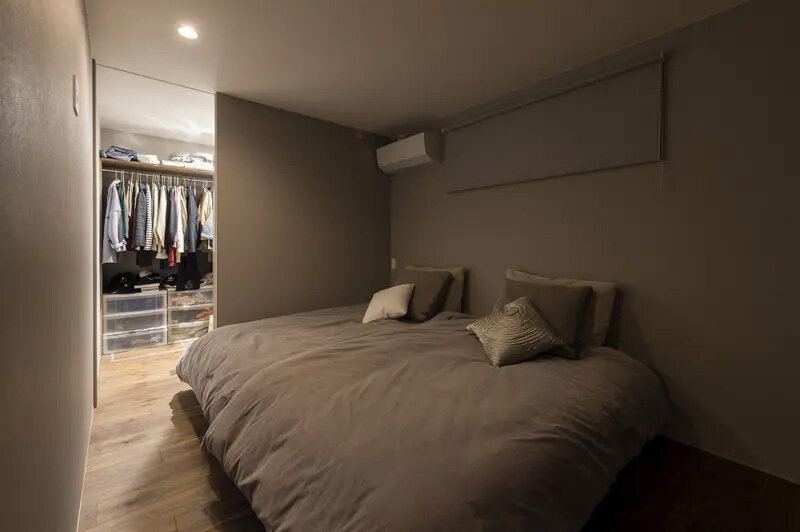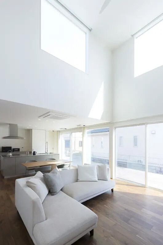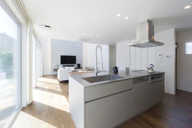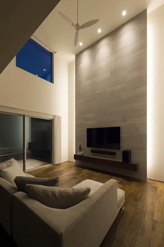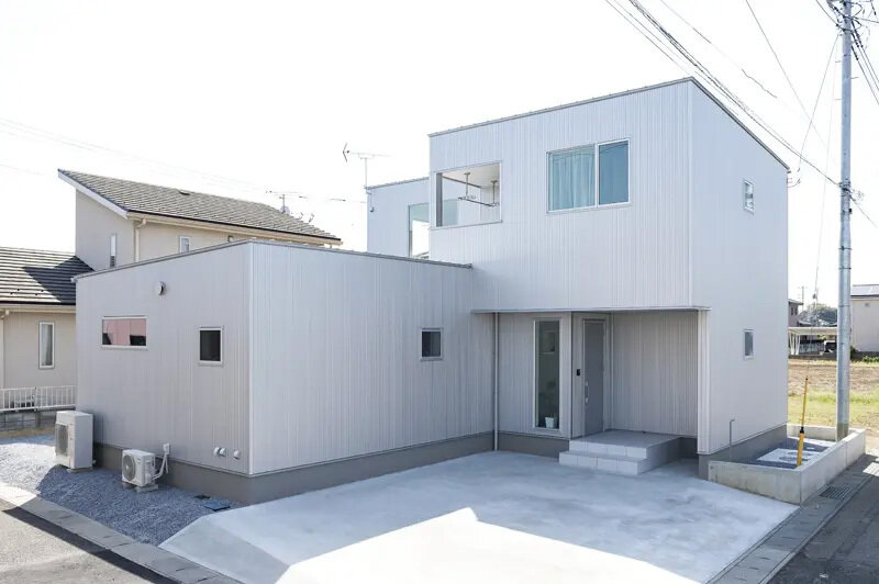 ARC style GALLERY 吹き抜けのあるグレイッシュな家 群馬県邑楽郡邑楽町 Concept シンプルでシャープな印象の外観に、グレイッシュカラーで統一されたシックなインテリア。リビングの吹き抜けには石目調のタイルを採用し、ダイナミックさを表現。会話が弾むアイランドキッチンは、オーダーならではの洗練されたデザインが特徴。夜は灯りを落として、間接照明の落ち着いた空間に癒される邸宅です。