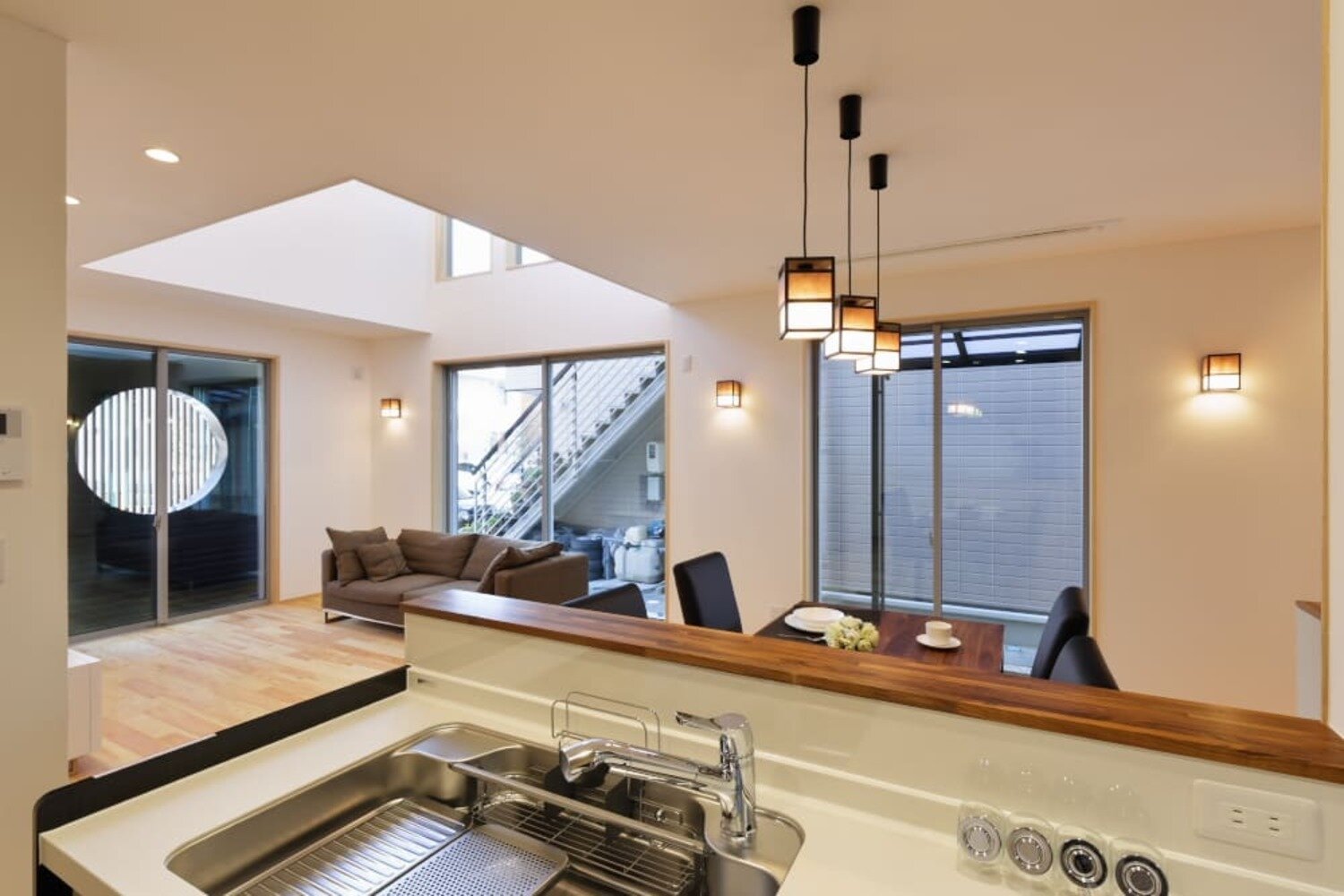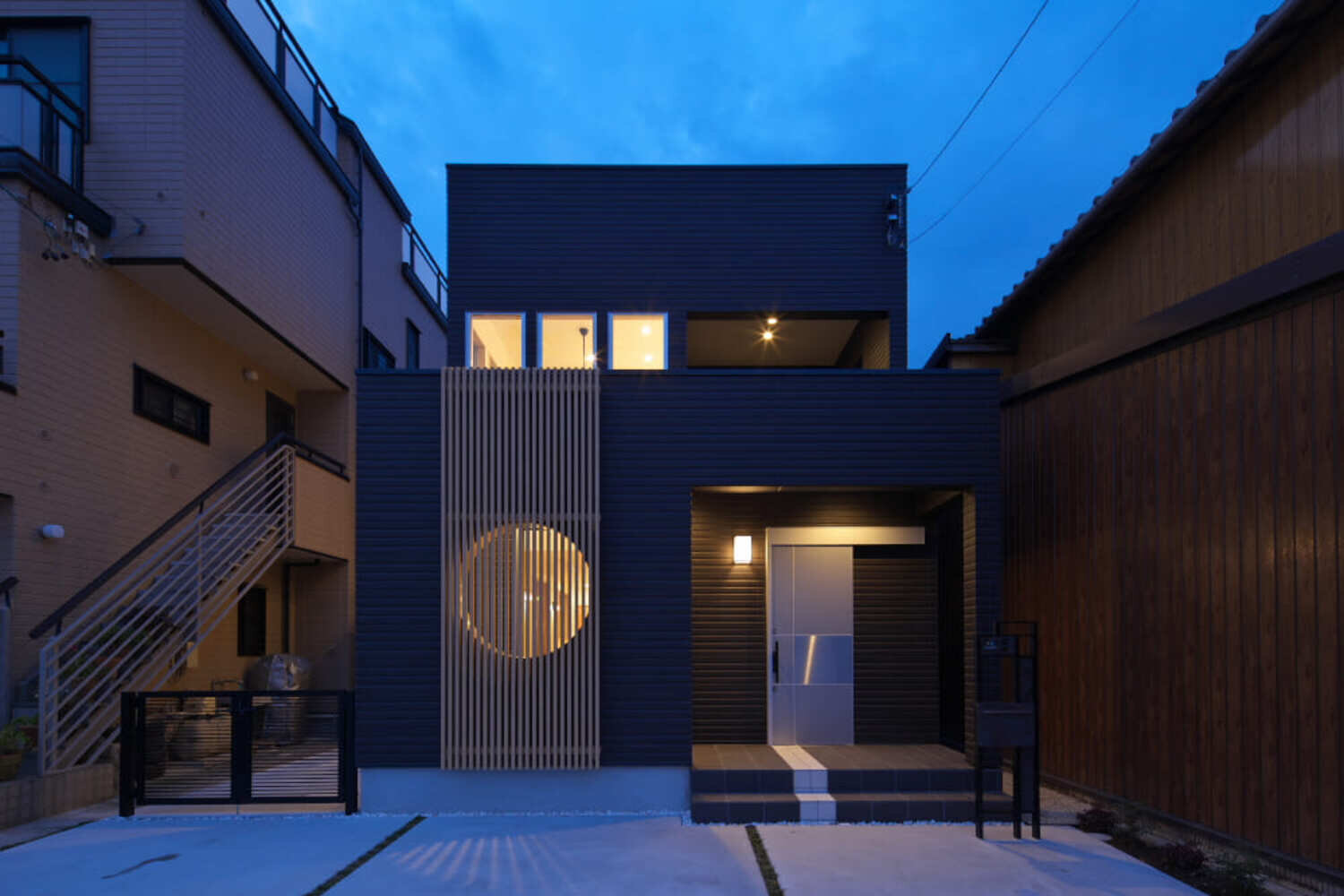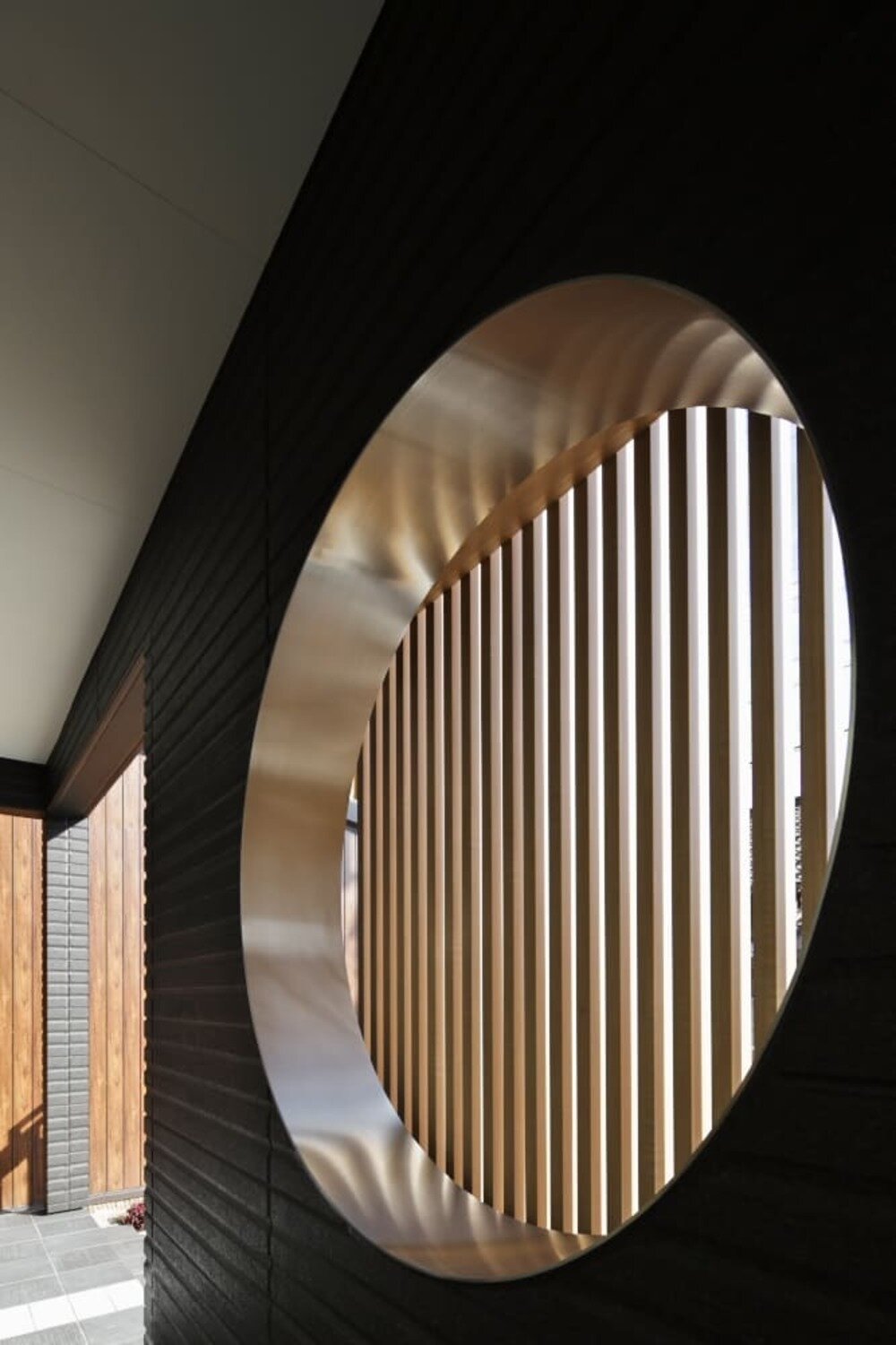 ARC style GALLERY 京町屋風の和モダン住宅 三重県 Concept 間口8m少々の土地で南側には3階建ての家があり、宅内にどうやって光を届けるかという事が原点で間取りの計画が開始されました。吹き抜けは南島角に配されています。印象的な丸い部分とルーバーは視線を緩やかに切りながら光を入れるためもあります。どこかの路地裏にでも迷い込んだかのような雰囲気がただよう、京町屋風の和モダン邸宅です。