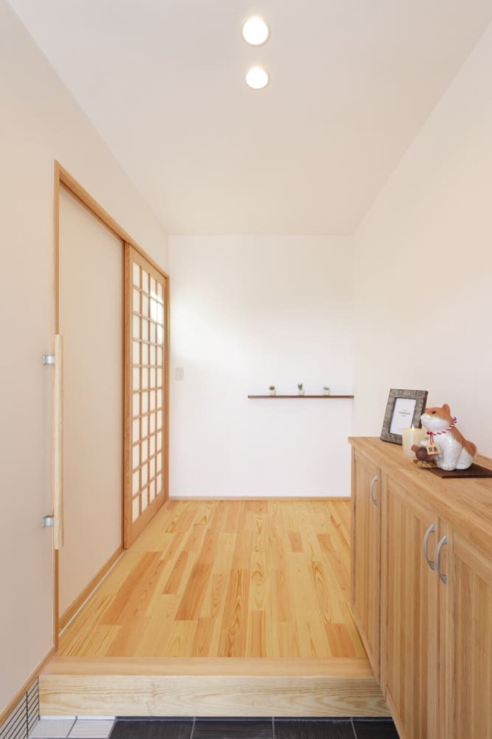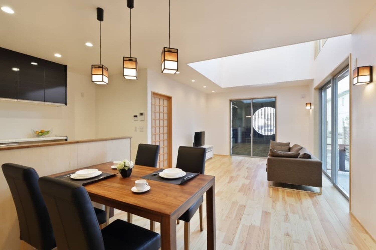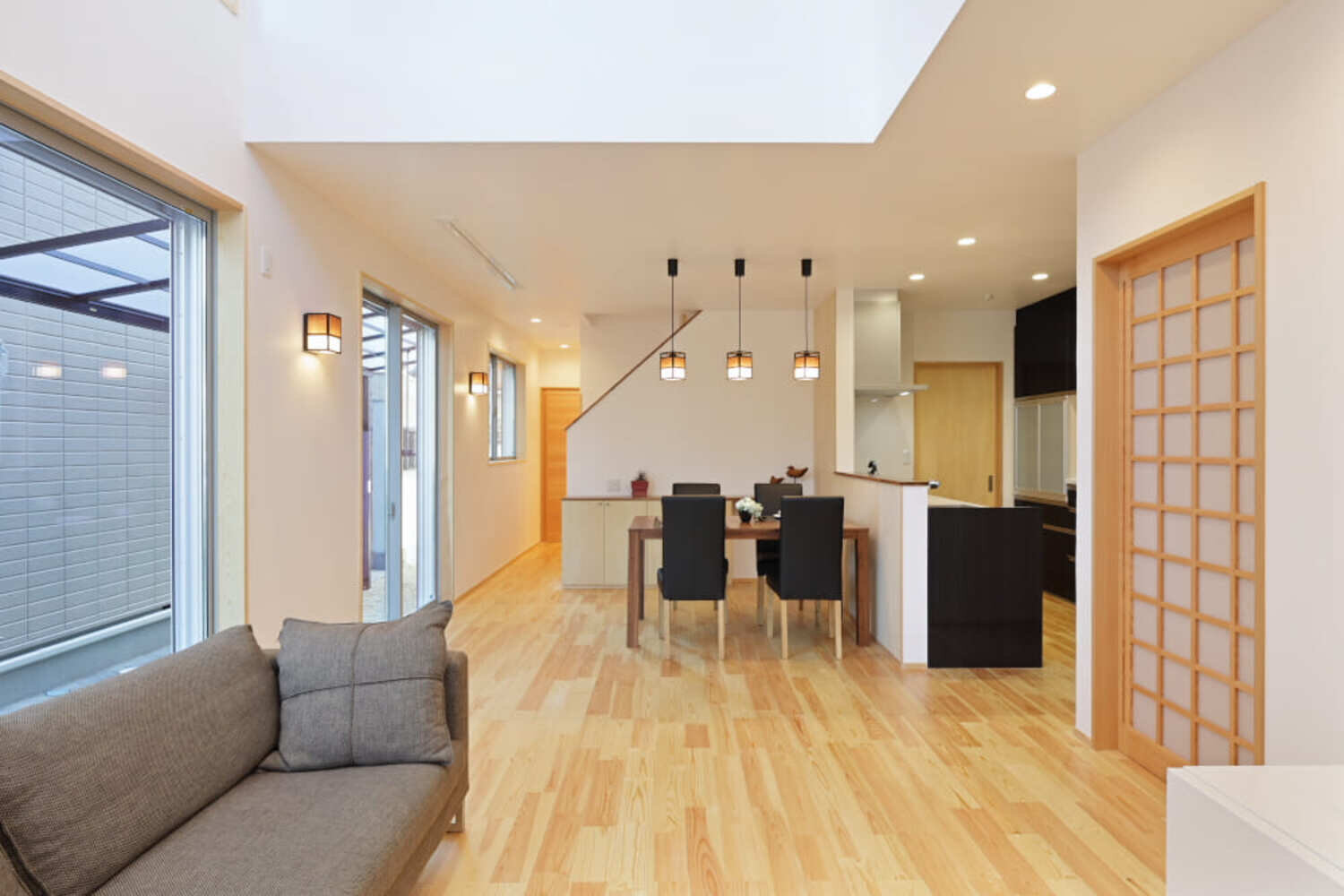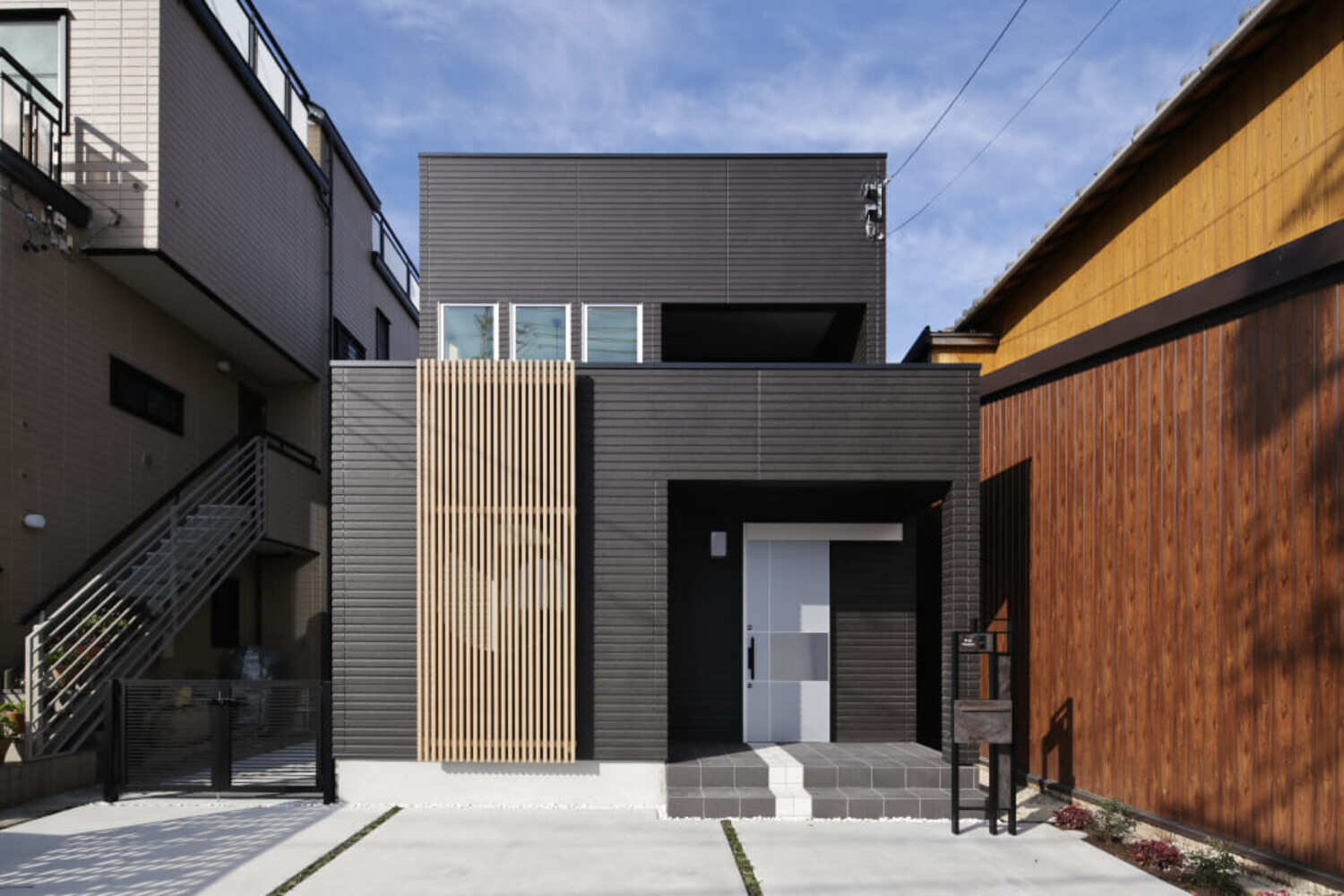 ARC style GALLERY 京町屋風の和モダン住宅 三重県 Concept 間口8m少々の土地で南側には3階建ての家があり、宅内にどうやって光を届けるかという事が原点で間取りの計画が開始されました。吹き抜けは南島角に配されています。印象的な丸い部分とルーバーは視線を緩やかに切りながら光を入れるためもあります。どこかの路地裏にでも迷い込んだかのような雰囲気がただよう、京町屋風の和モダン邸宅です。
