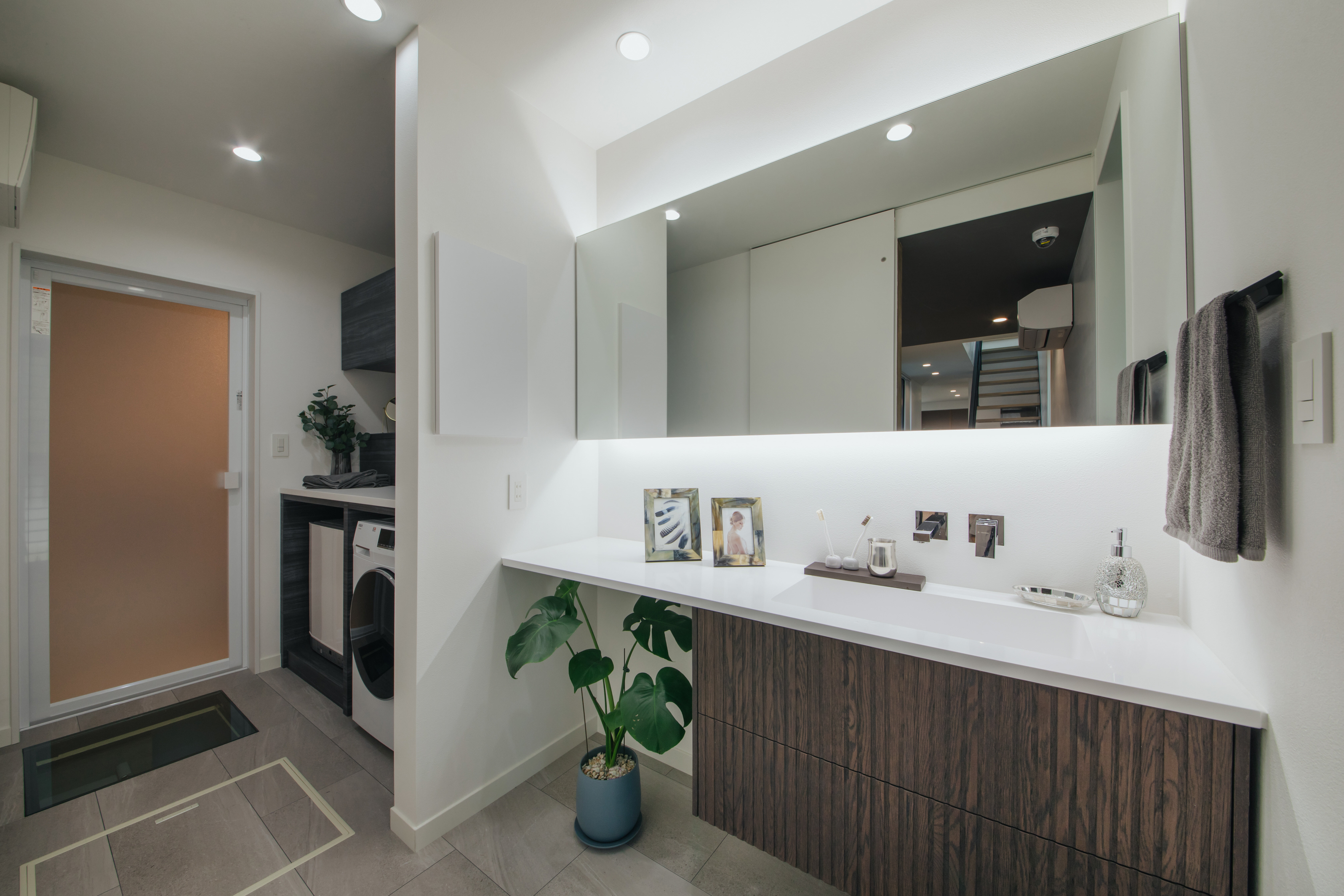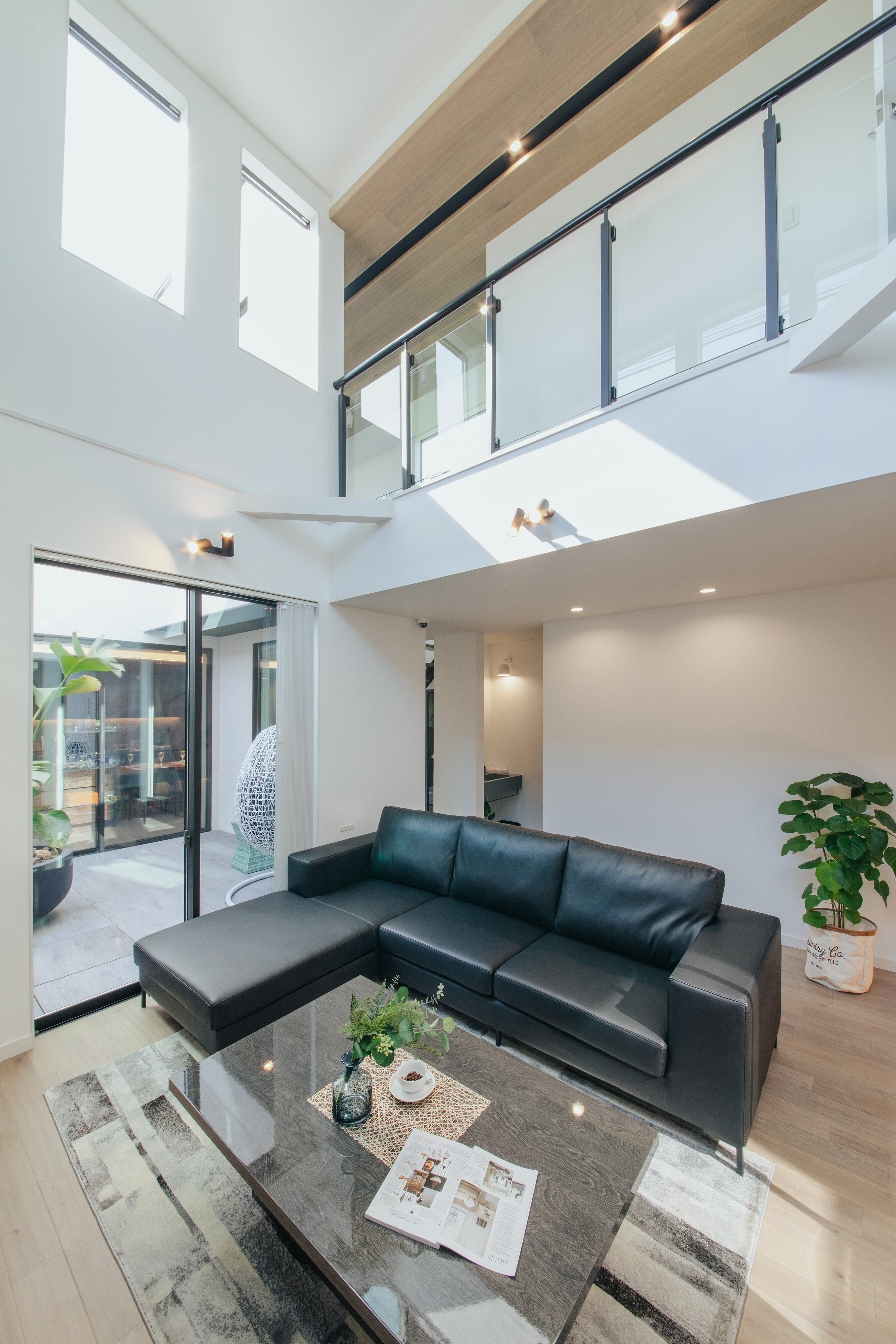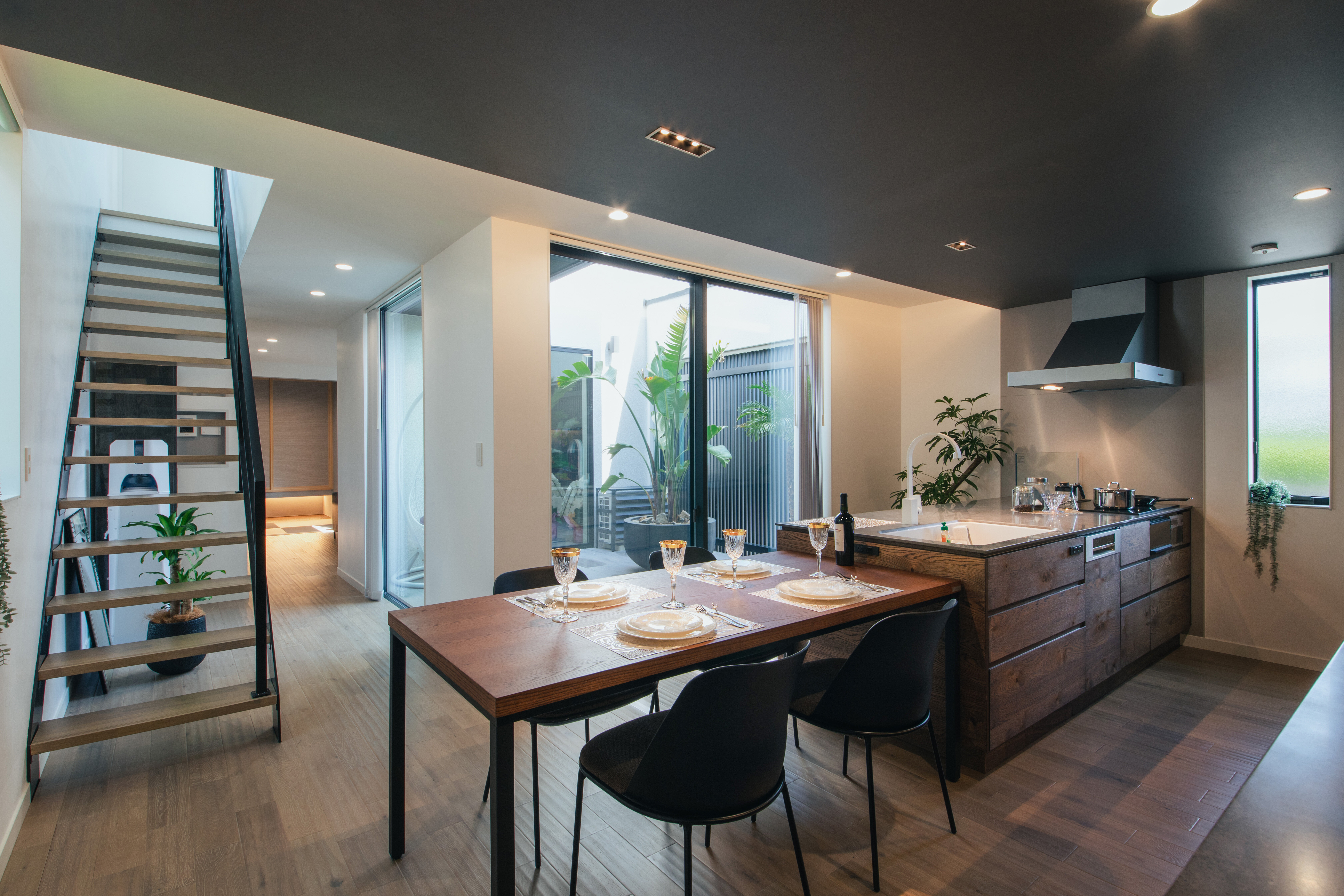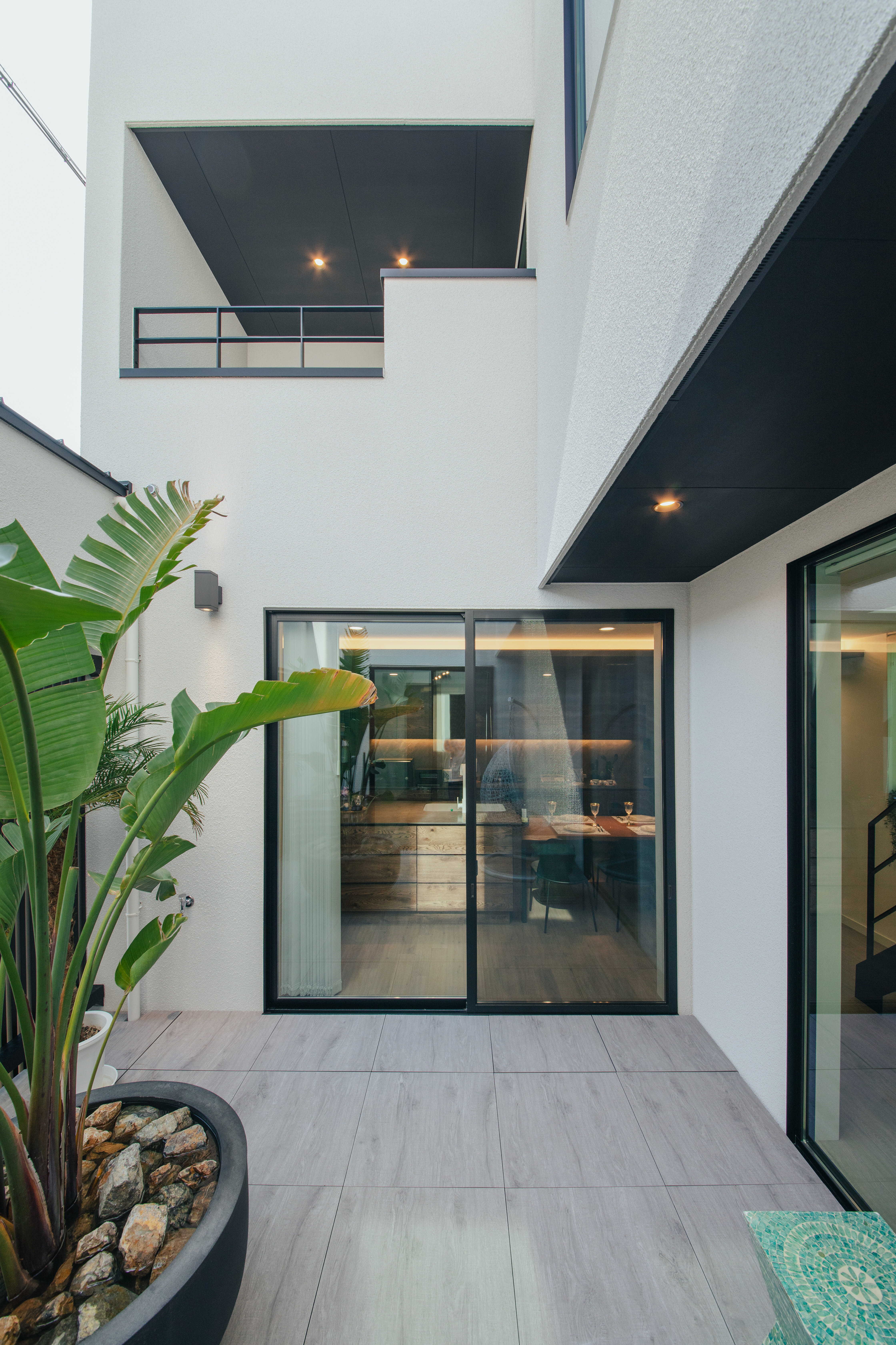 ARC style GALLERY プライバシーと開放感を両立したホテルライクな住まい 静岡県 Concept 2つの箱を並べたようなスタイリッシュな外観デザイン。1階の中心にはプライベートパティオがあり、アウトドアリビングとして過ごし方は無限に広がります。リビングに入った瞬間、思わず歓声を上げたくなる吹抜けの大空間。パティオを挟んだ向こうにダイニングキッチンを配置したことで空間にメリハリがつきます。プライバシーを守りつつ、開放感があるホテルライクな住宅です。