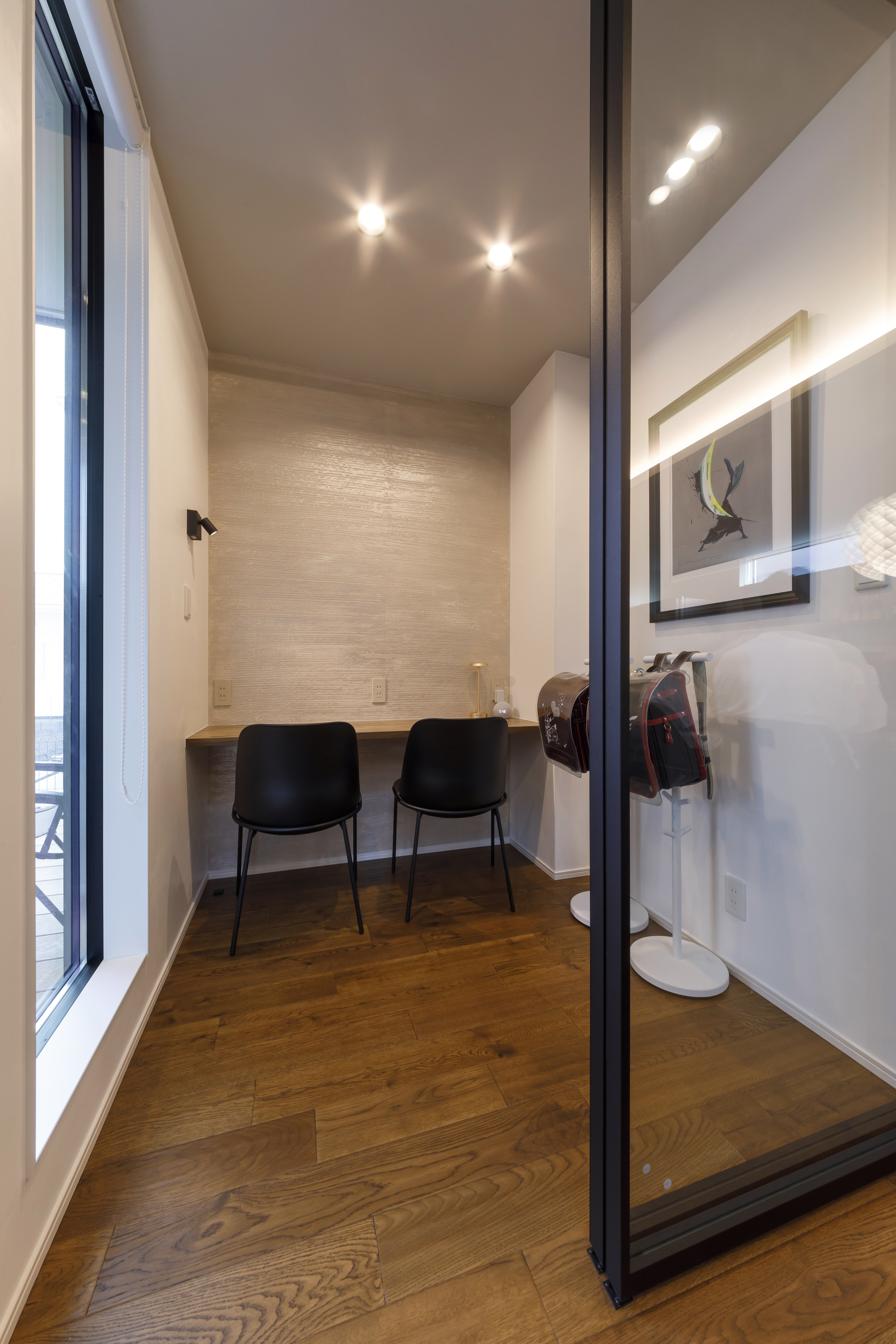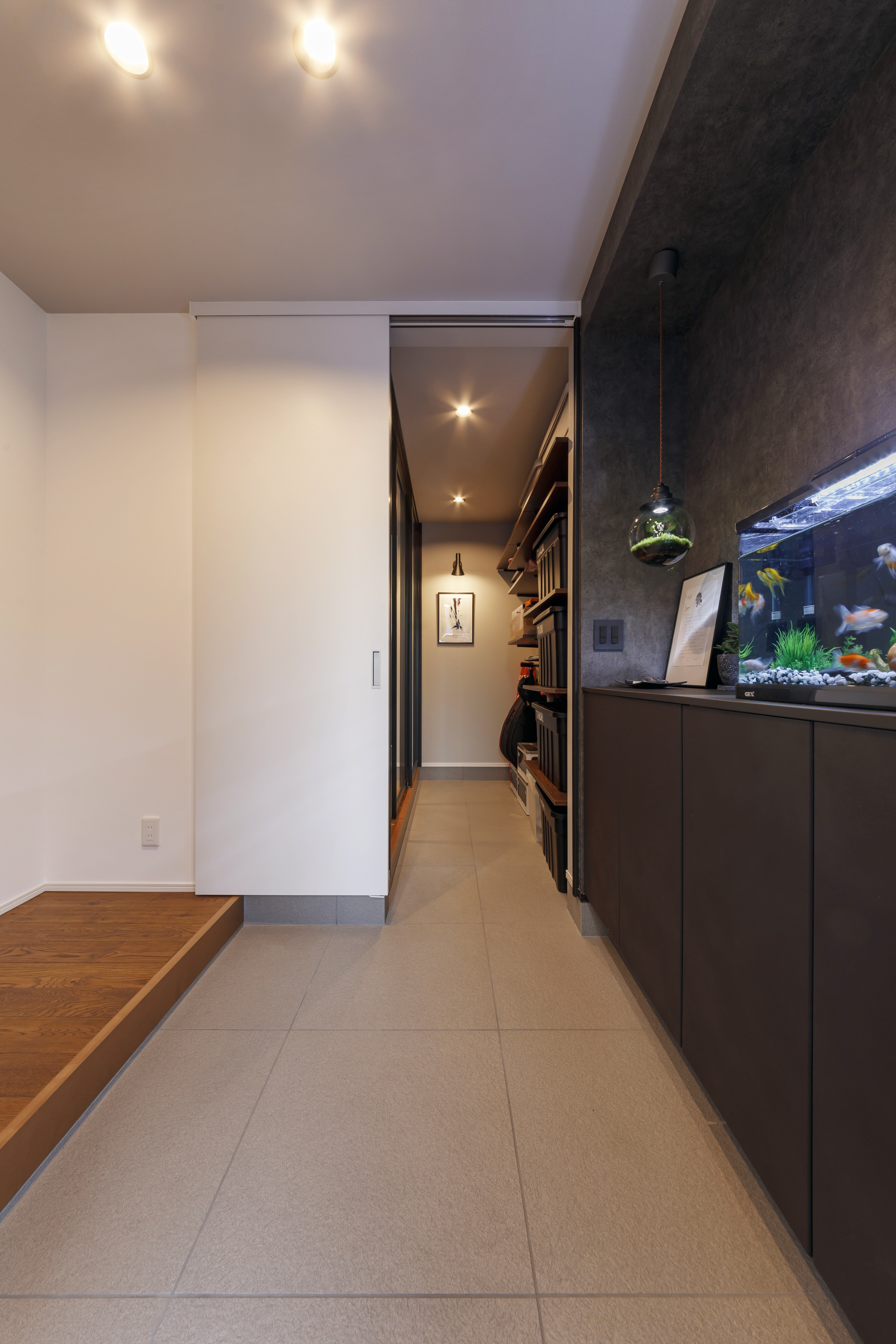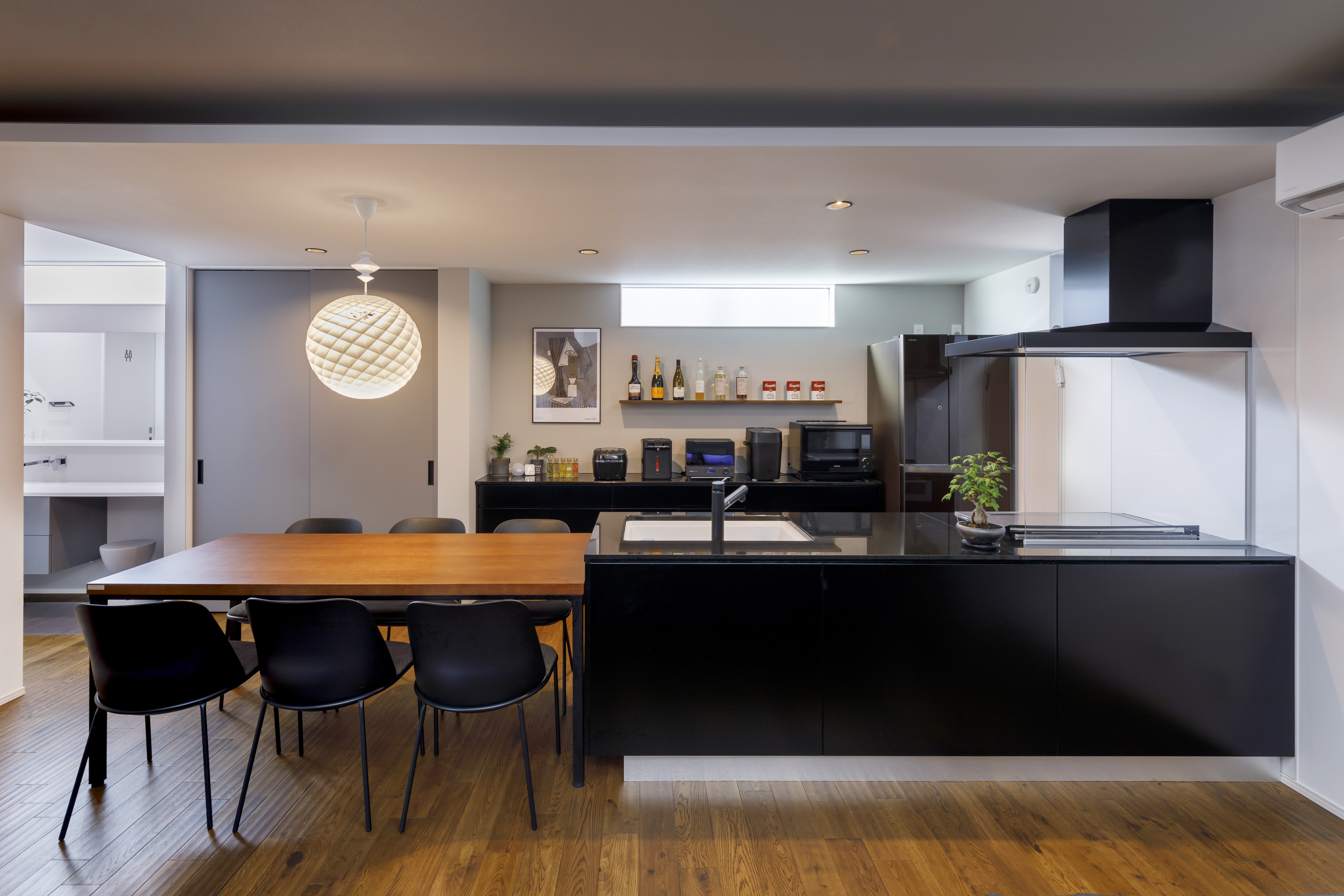 無彩色×木目の空間に美しい灯がともる、宇宙を感じる家