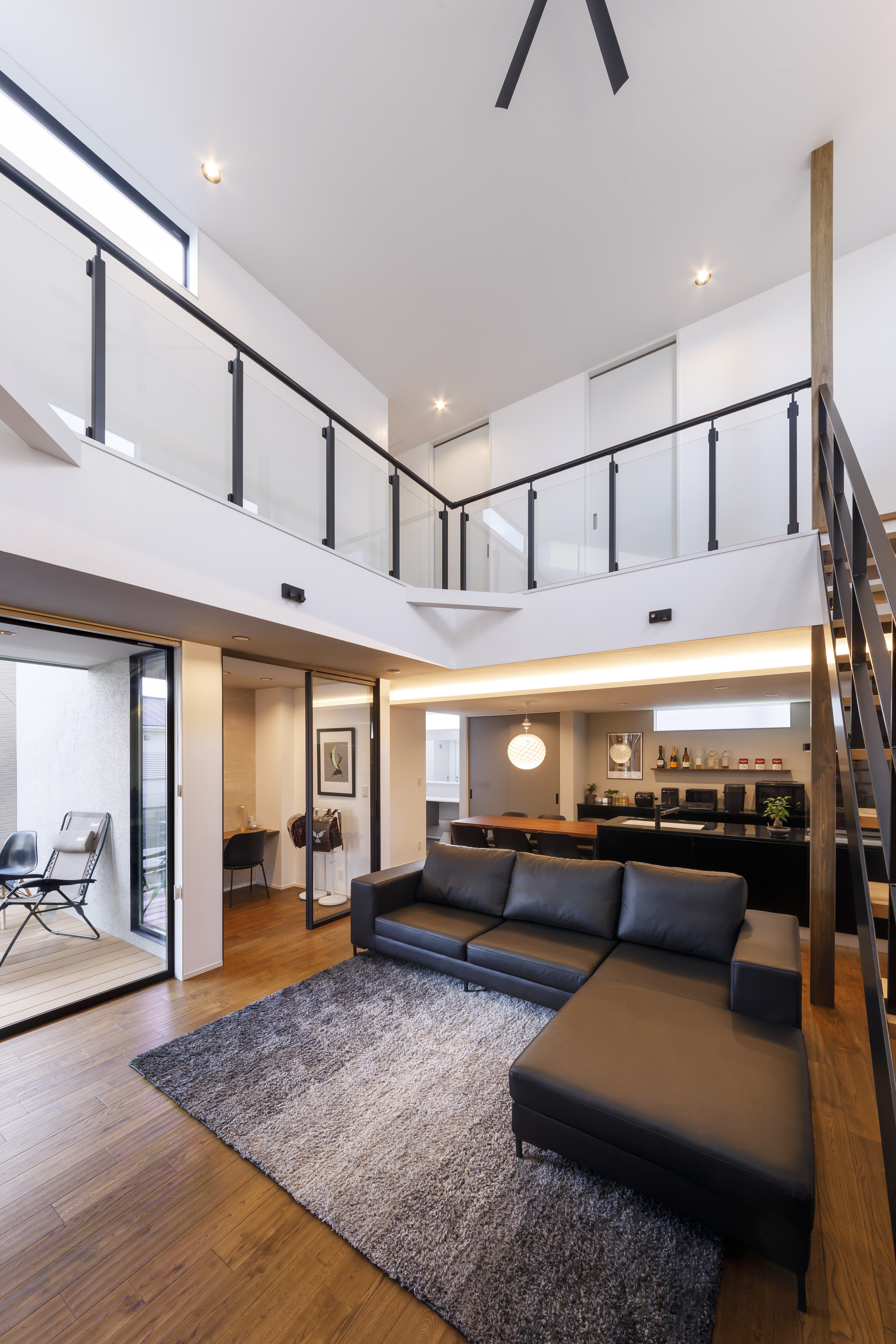 ダイナミックな吹抜けのLDKは、天井まで届く大開口を開けると中庭とつながり、より開放感が生まれます。