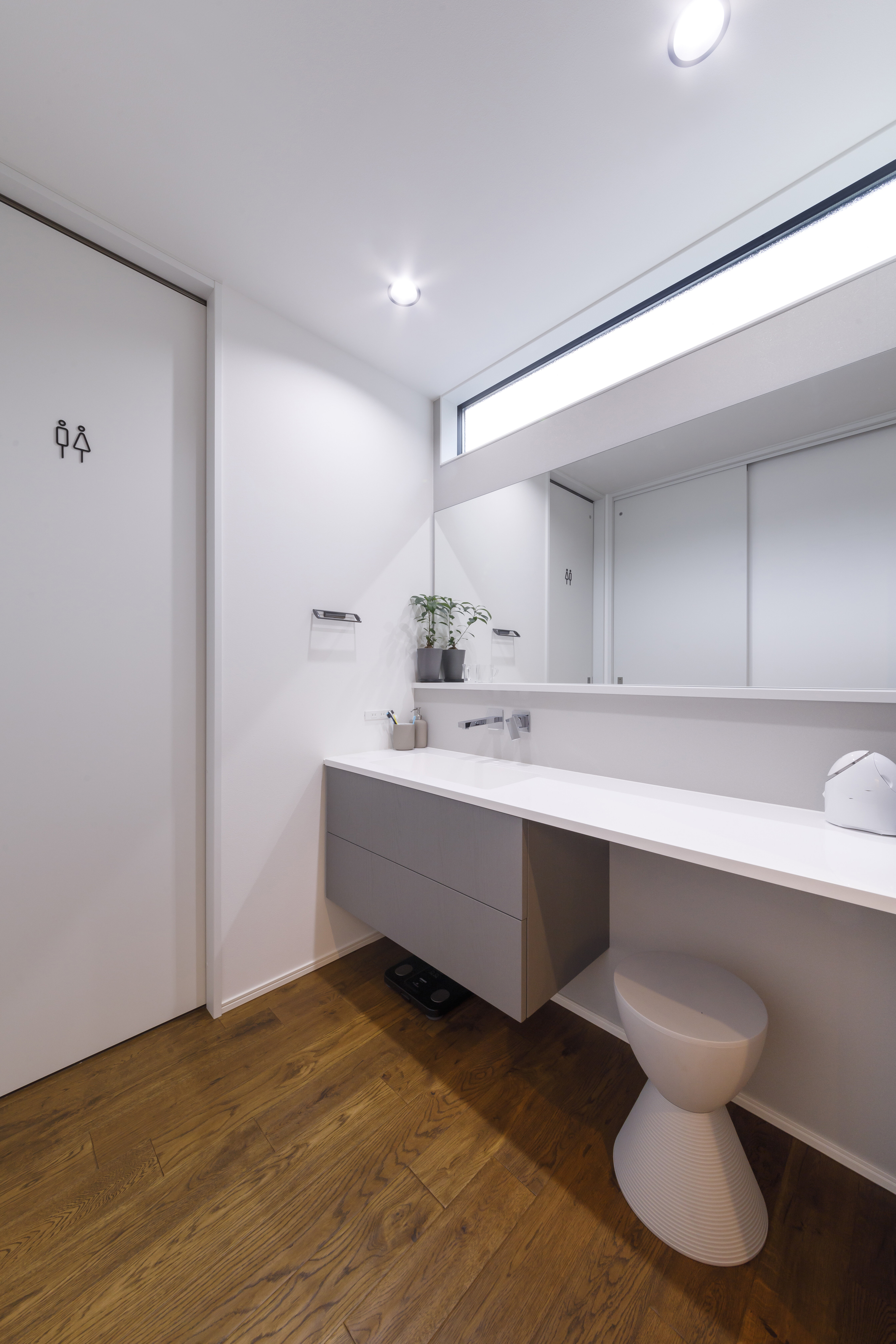 折下げ天井、パントリー、クロスをマットグレーで統一し、ニュアンスを出しました。キッチンからサニタリーへのアクセスもスムーズで、忙しい共働きご夫婦の家事時間を短縮します。