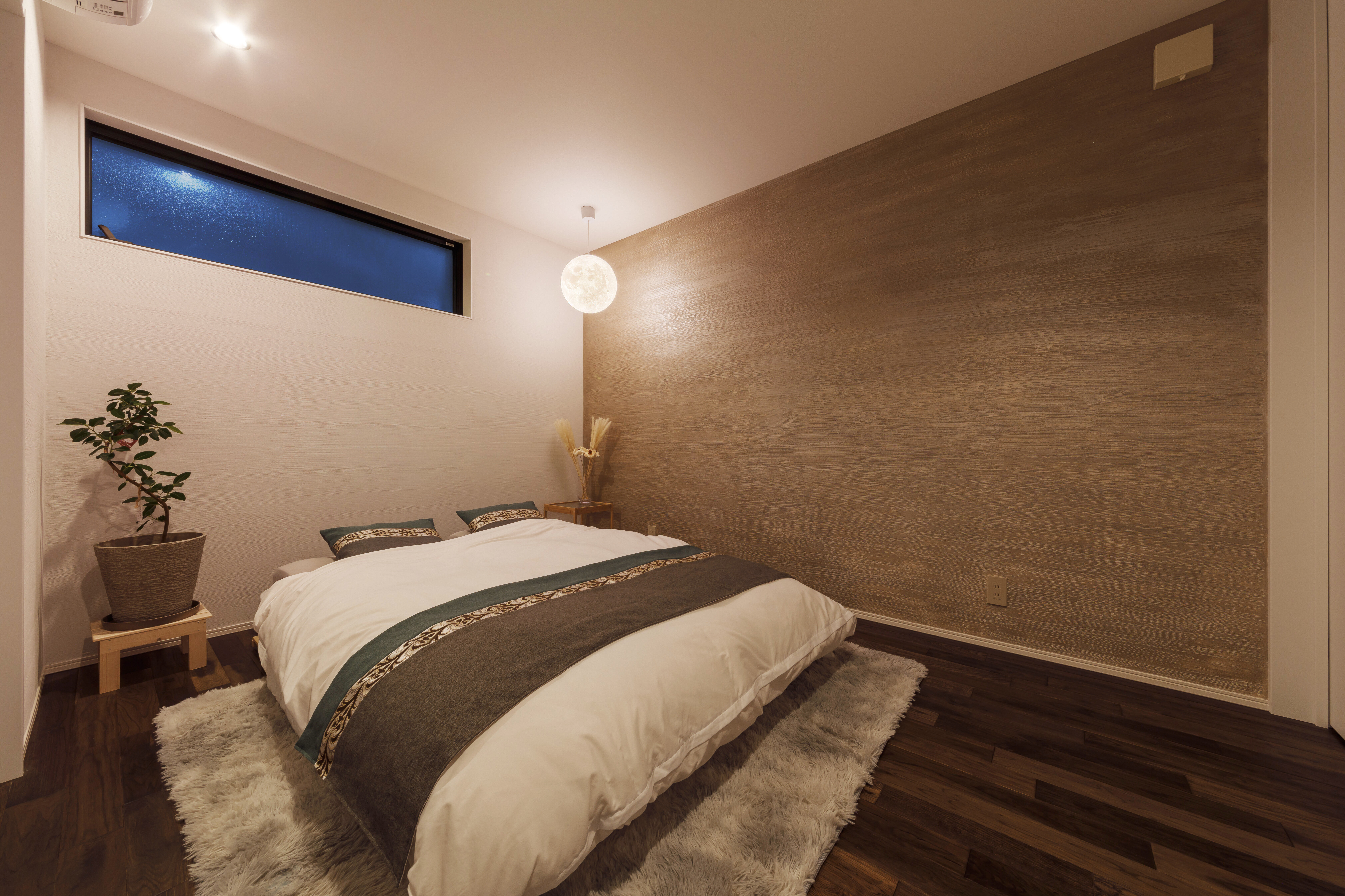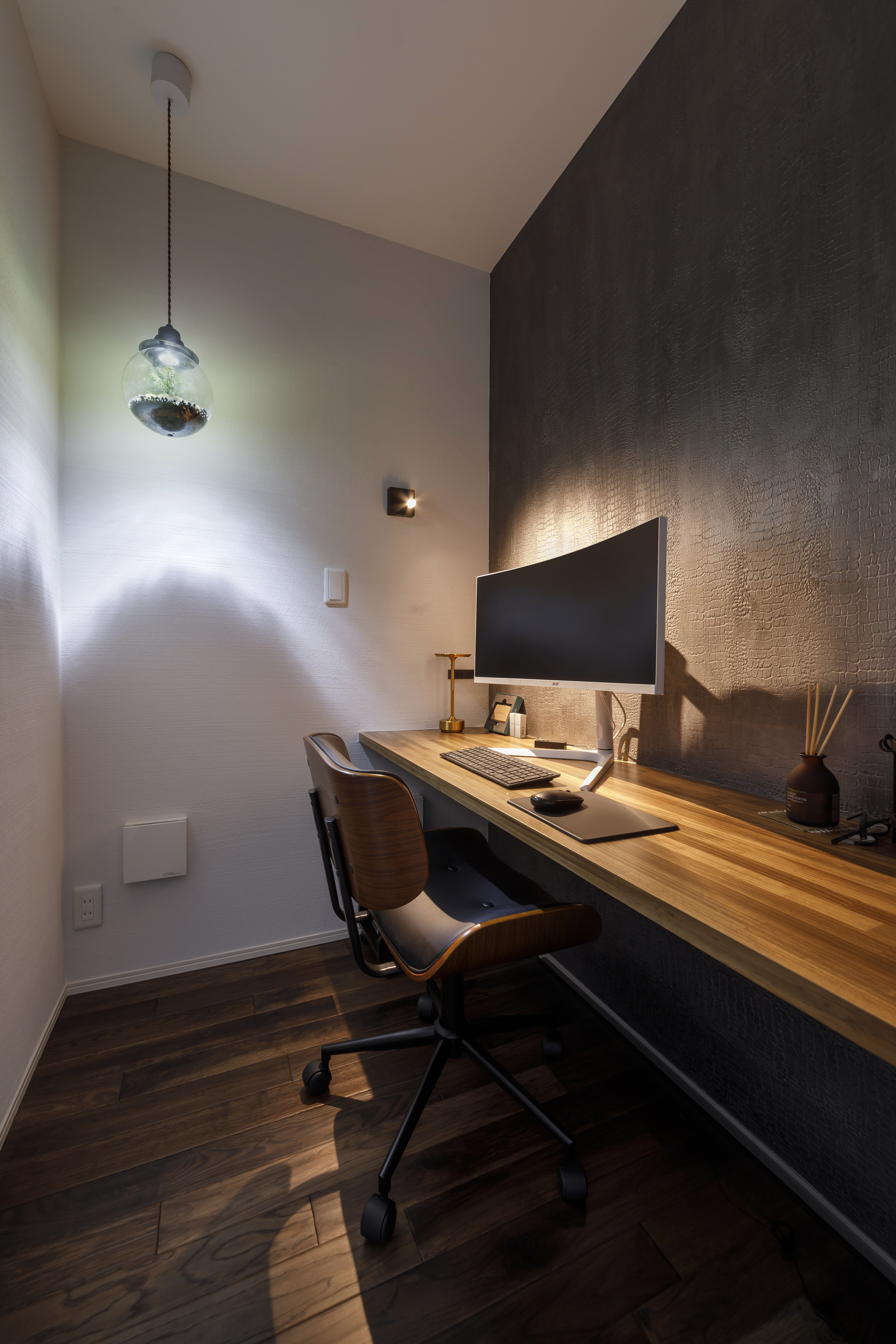 無彩色と木目の空間に美しい灯がともる、宇宙を感じるようなナチュラルモダンな住宅です。