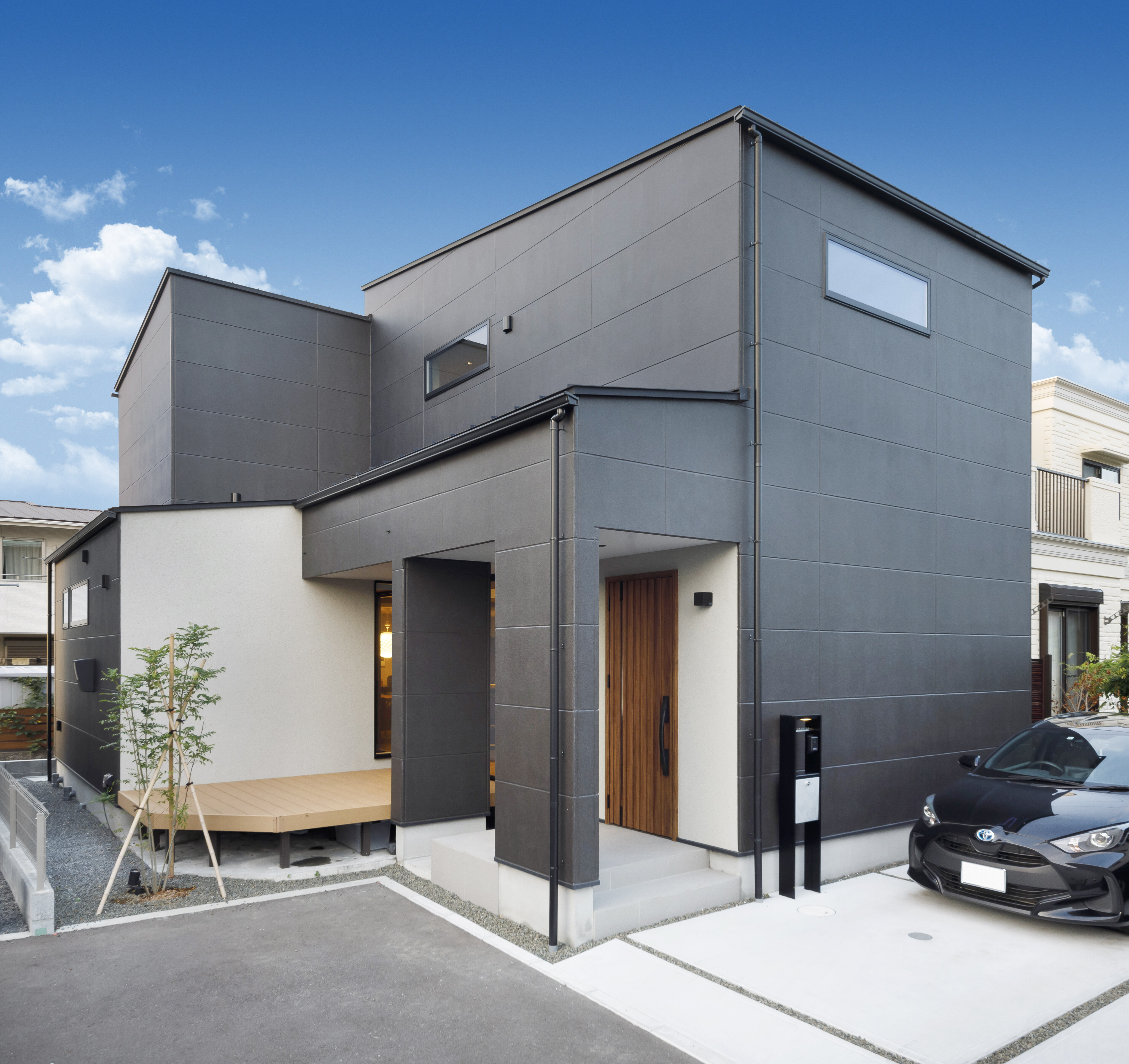 モノトーンのコントラストでメリハリのある外観デザイン。幅の広いグレーのALCと白い塗り壁のコントラストがステキです。