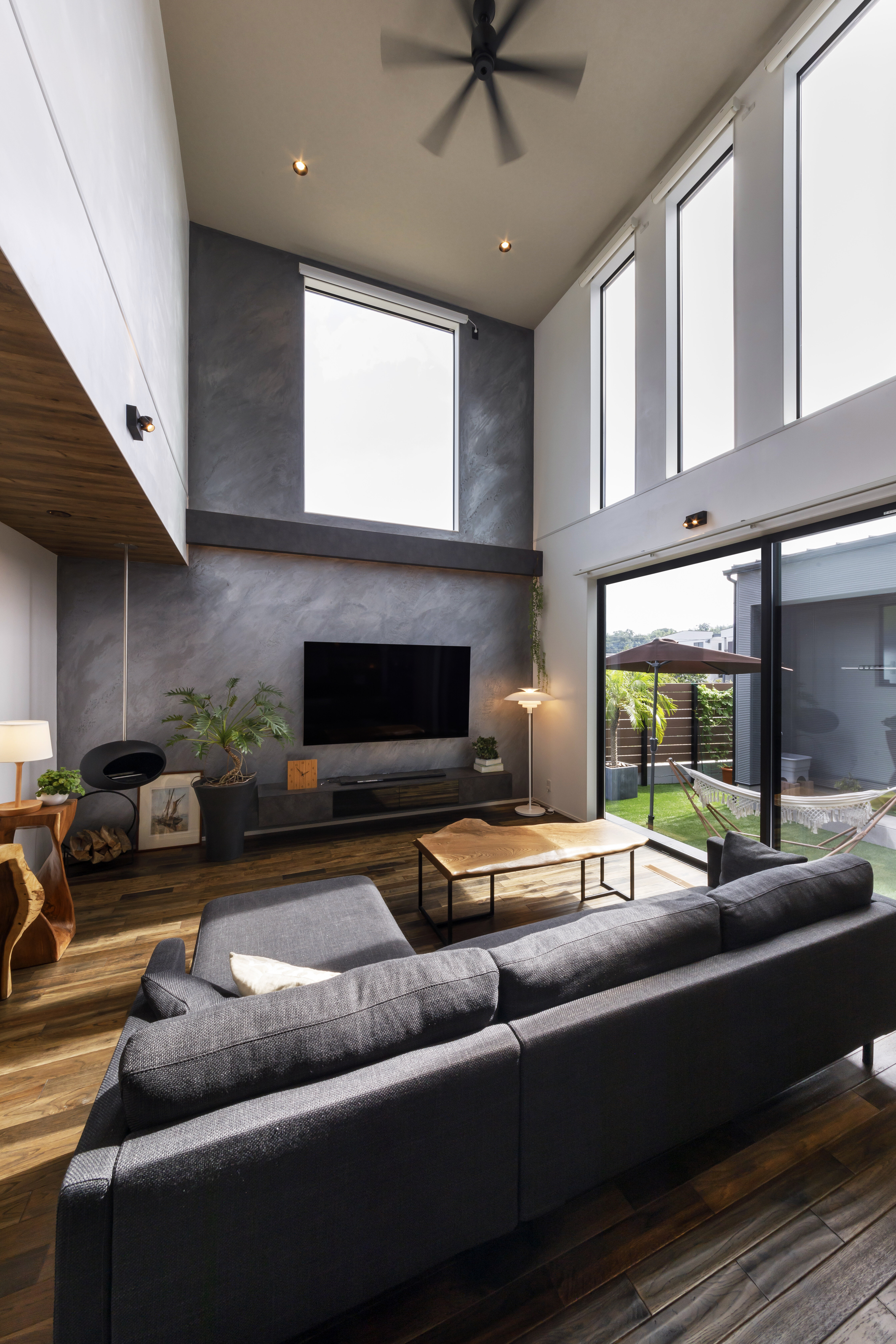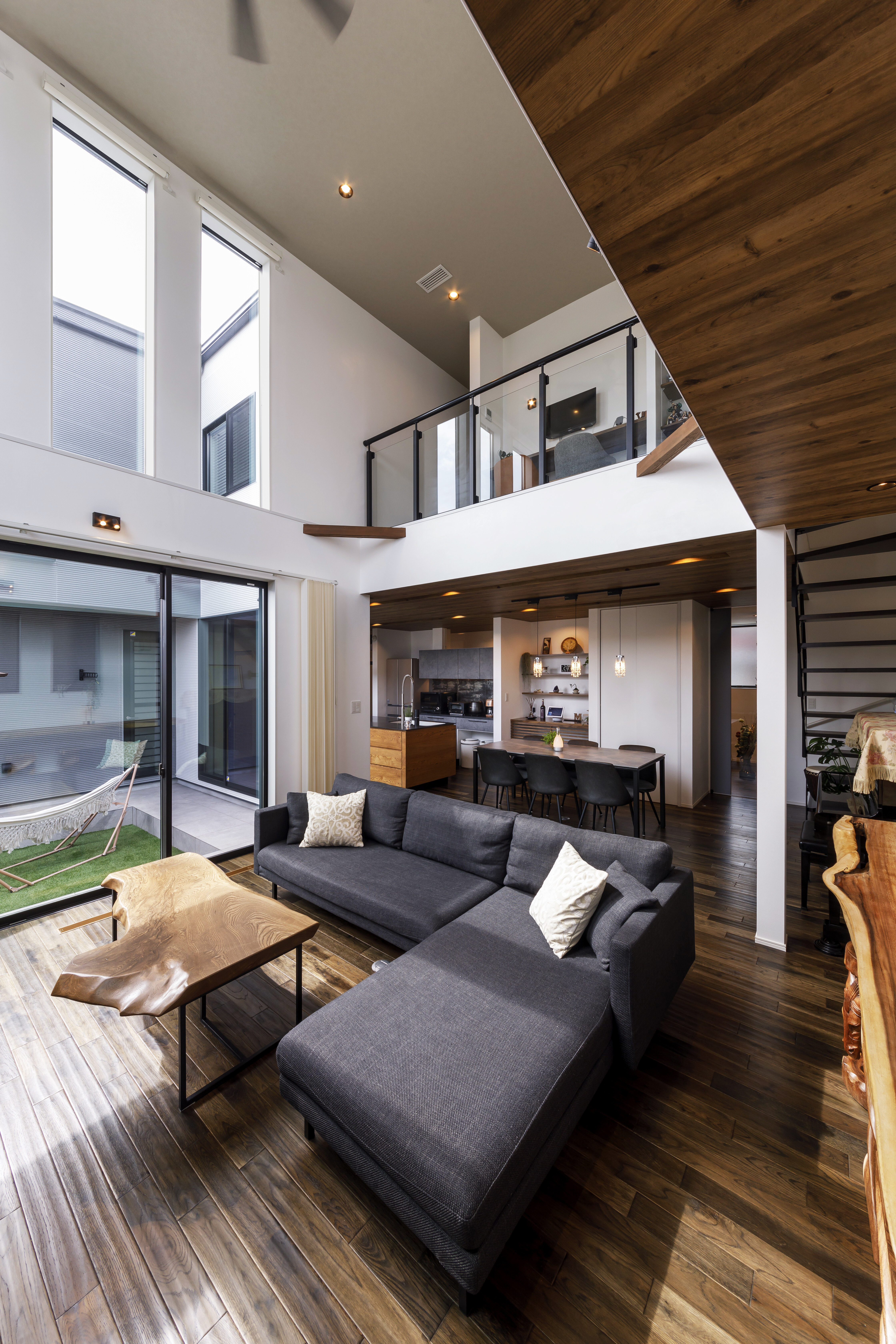 吹抜けのリビングにコの字に囲われた中庭は、プライベート感が満載でお家にいながらリゾート気分を満喫できます。