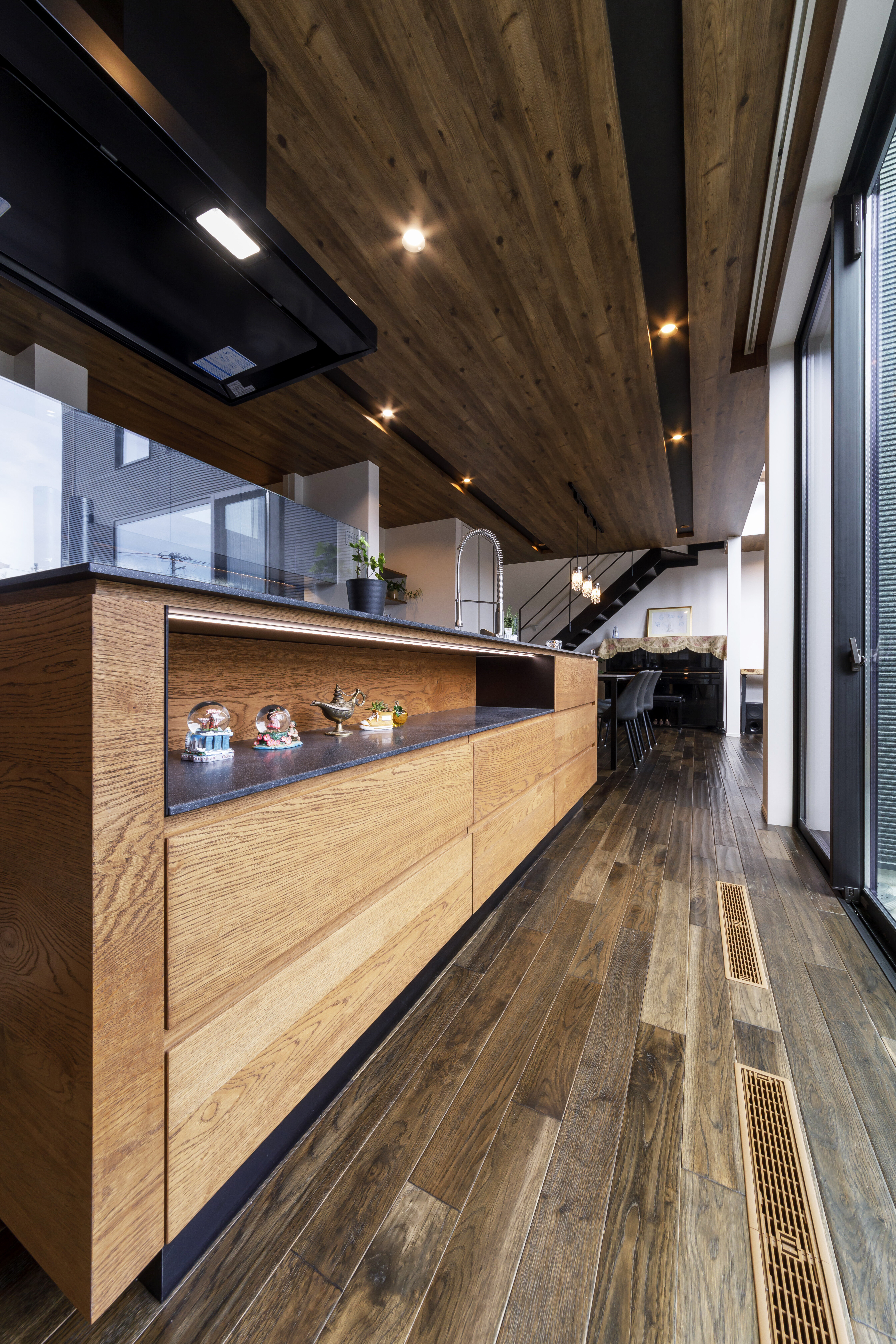 LDKは外と内が曖昧につながり、より開放感を得られます。テレビステーションにイタリア漆喰「ユーロスタッコ」を贅沢に塗って、空間をよりゴージャスに引き立てています。