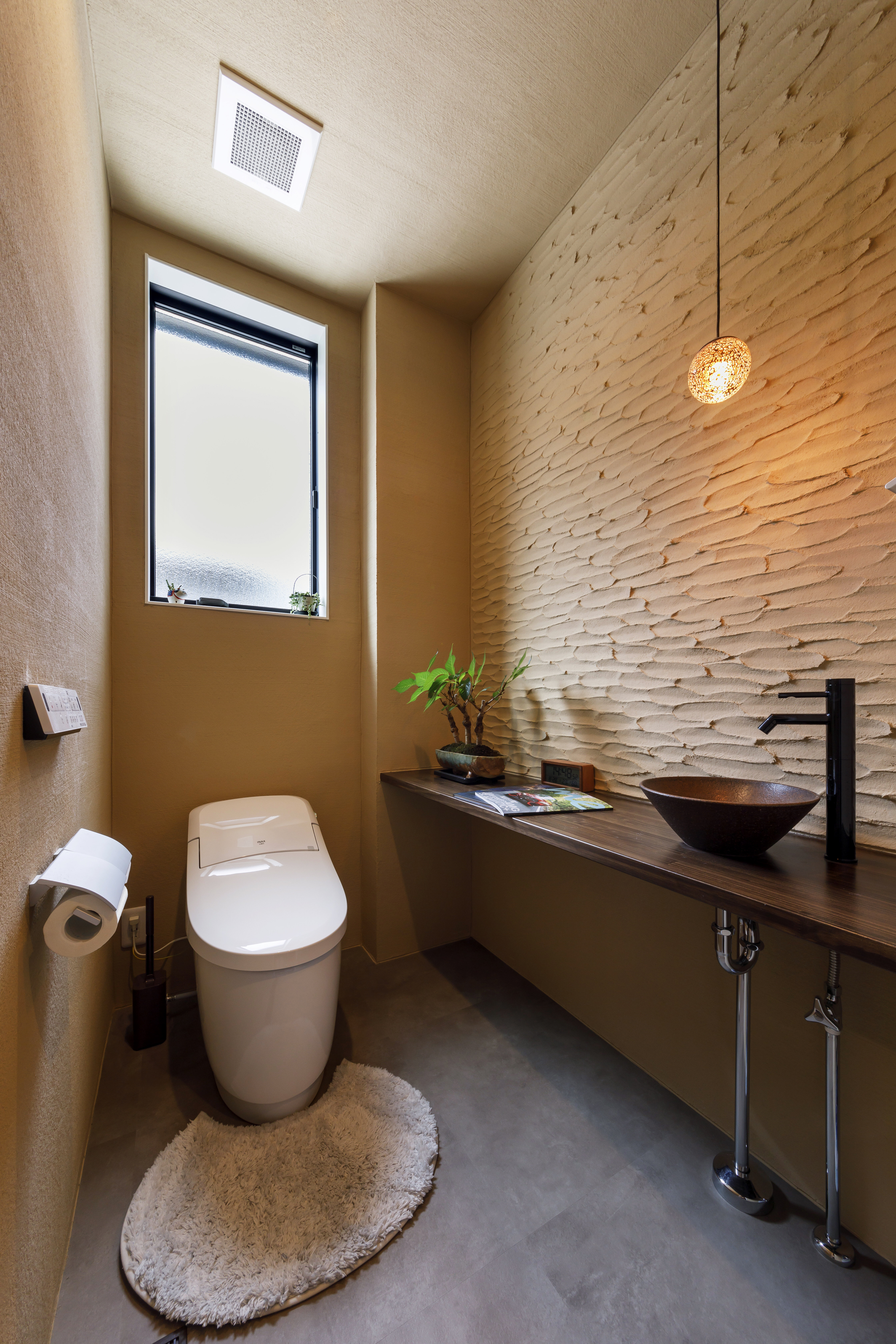 落ち着いたベージュのカラーで統一したトイレは、消臭・調湿効果に優れた薩摩中霧島壁がアクセントになっています。