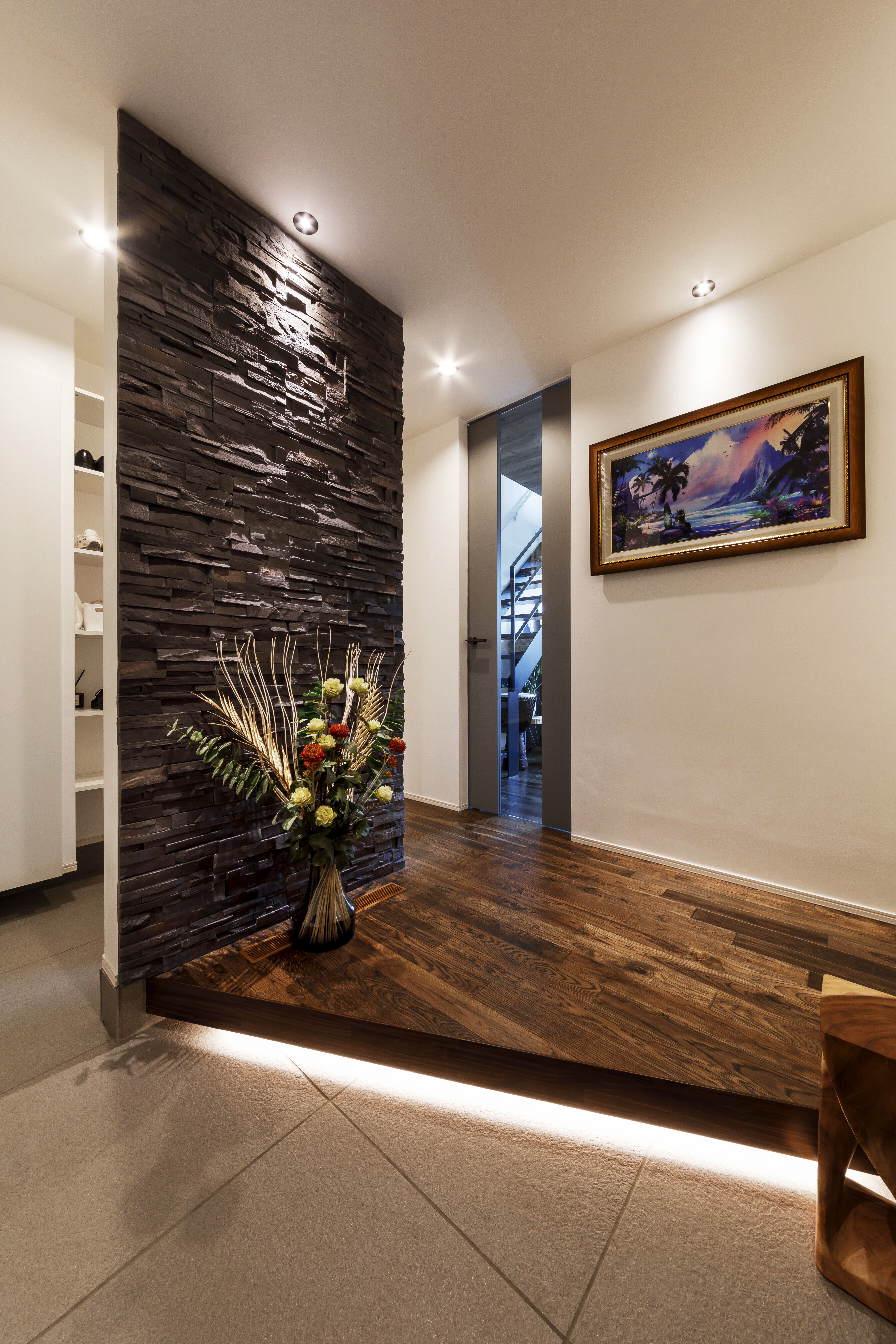 大家族でもゆったりと使える広い玄関ホールは、仕切り壁に重厚感のあるタイルを貼って高級感を演出しました。