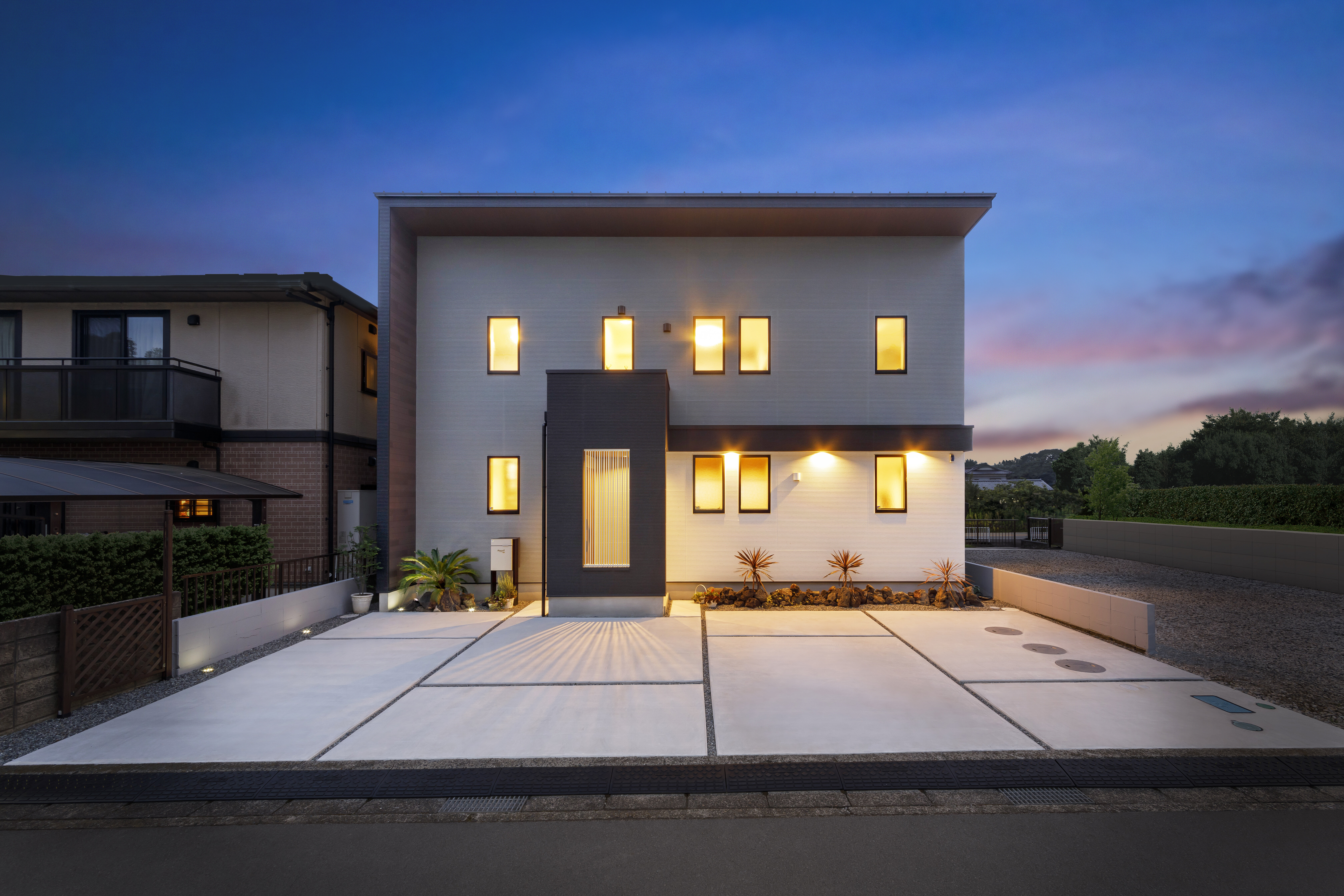 グレーと白のツートンカラーを採用し、窓のラインが美しく揃った外観デザイン。玄関部分を隠すようにデザイン的な格子を入れています。