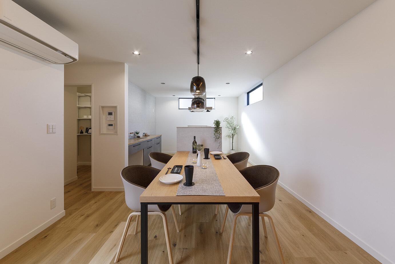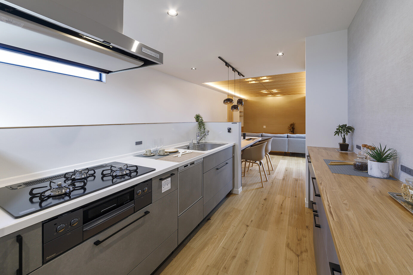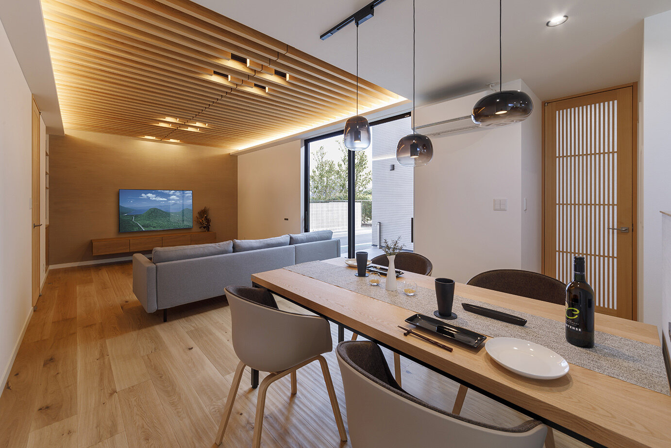 日差しが差し込む屋根付きの中庭を中心としたコの字の平屋。中庭に隣接したリビングは格子天井を間接照明で照らして毎日の暮らしをワンランクアップ。落ち着いた雰囲気がお家で過ごす時間を豊かにします。木格子が目を引く心地よい玄関ホール。奥には2帖のクロークがあるので収納にも困りません。キッチンと横並びのダイニング。キッチンの腰壁をあえて高くしたことで作業中のキッチン内を隠しスッキリとみせます。背面にはパントリーがあるので収納量も◎24帖のLDKは一目で家族の様子を見渡せる配置になっています。ダイニングセット・ソファ・AVボードはnattoku住宅のオリジナルで標準仕様。木目が美しいオリジナルの洗面台(ルシェーロアルベロ)を主役にした2帖の洗面スペース。その奥の脱衣室にはガス衣類乾燥機を設置しました。モスグリーンのクロスでトーンダウンした主寝室。間接照明で照らされた白い壁は、消臭・調湿効果の高い薩摩中霧島壁。たっぷり4帖ウォークインクローゼットを備えています。使いやすさにこだわったⅡ型のキッチン。カップボードの上にはお気に入りの家電や雑貨を飾り、インテリアを楽しめます。ダイニングからキッチンの周りをぐるりと回遊できる動線になっているのも暮らしやすい工夫の一つです。