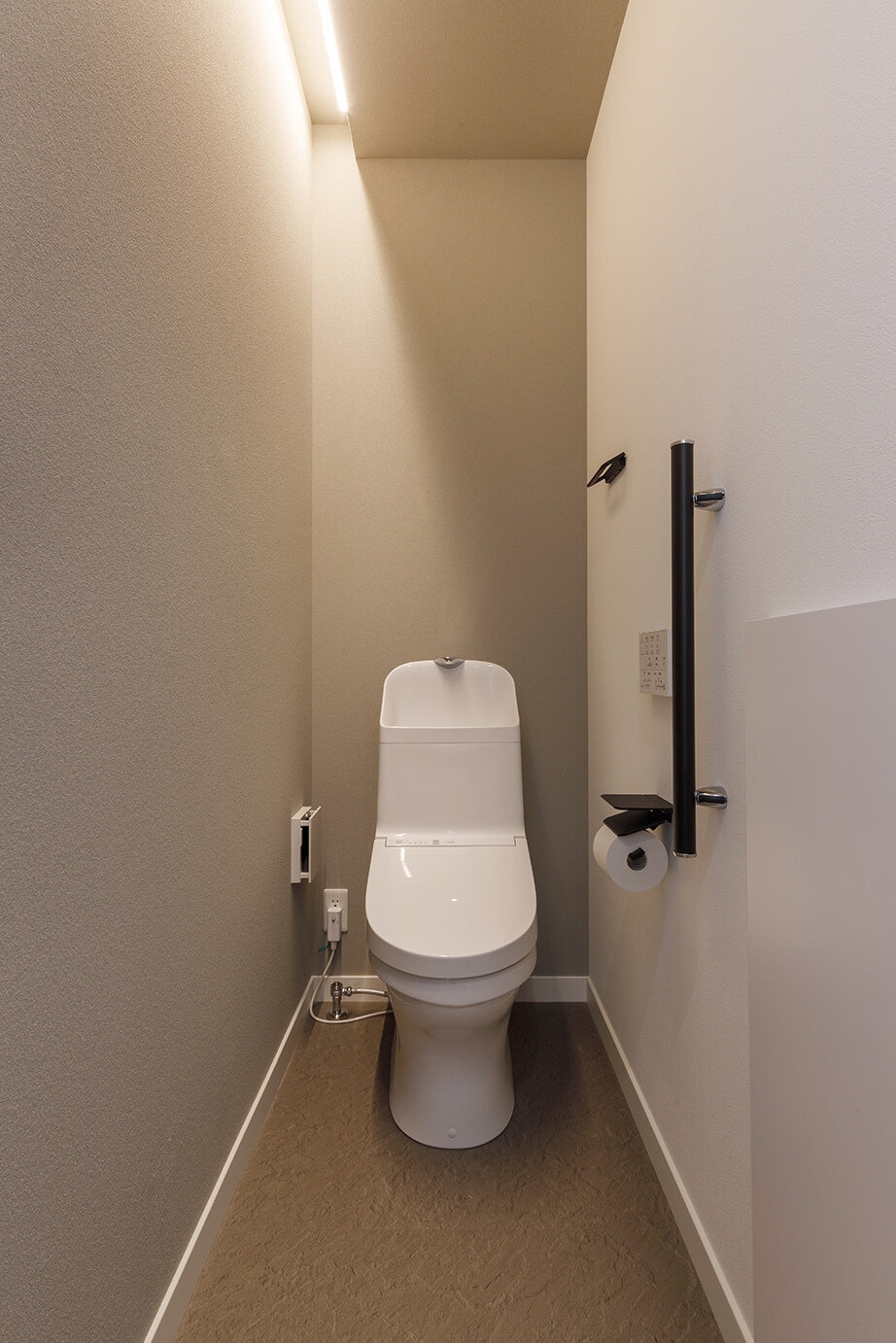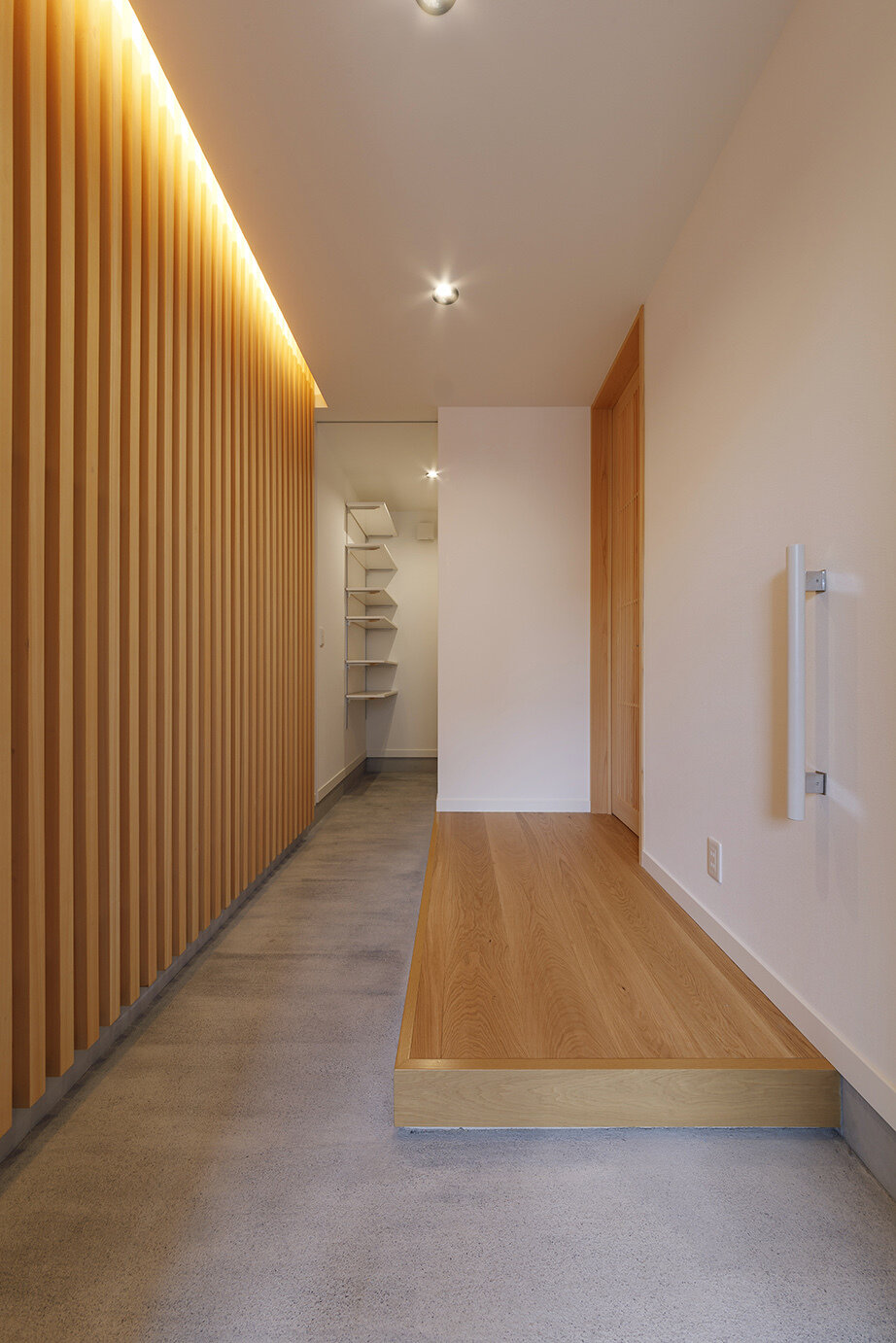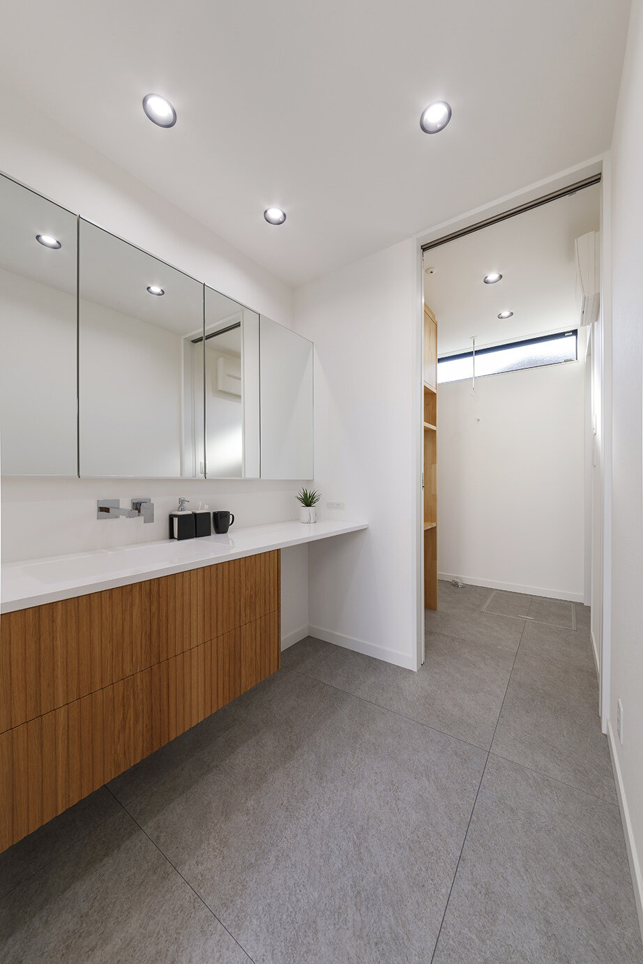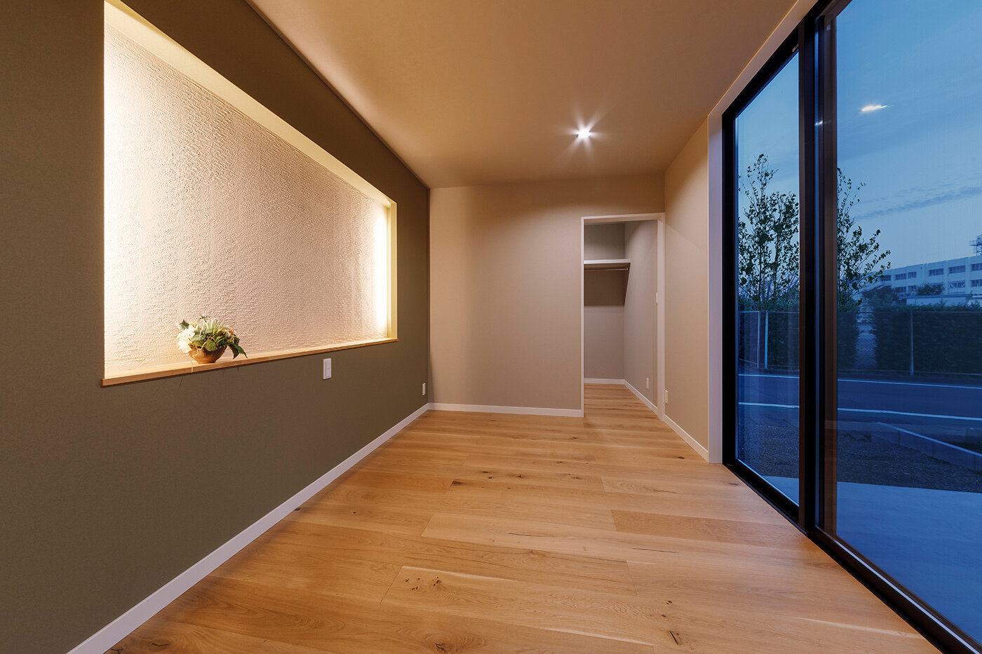 日差しが差し込む屋根付きの中庭を中心としたコの字の平屋。中庭に隣接したリビングは格子天井を間接照明で照らして毎日の暮らしをワンランクアップ。落ち着いた雰囲気がお家で過ごす時間を豊かにします。木格子が目を引く心地よい玄関ホール。奥には2帖のクロークがあるので収納にも困りません。キッチンと横並びのダイニング。キッチンの腰壁をあえて高くしたことで作業中のキッチン内を隠しスッキリとみせます。背面にはパントリーがあるので収納量も◎24帖のLDKは一目で家族の様子を見渡せる配置になっています。ダイニングセット・ソファ・AVボードはnattoku住宅のオリジナルで標準仕様。木目が美しいオリジナルの洗面台(ルシェーロアルベロ)を主役にした2帖の洗面スペース。その奥の脱衣室にはガス衣類乾燥機を設置しました。モスグリーンのクロスでトーンダウンした主寝室。間接照明で照らされた白い壁は、消臭・調湿効果の高い薩摩中霧島壁。たっぷり4帖ウォークインクローゼットを備えています。使いやすさにこだわったⅡ型のキッチン。カップボードの上にはお気に入りの家電や雑貨を飾り、インテリアを楽しめます。ダイニングからキッチンの周りをぐるりと回遊できる動線になっているのも暮らしやすい工夫の一つです。