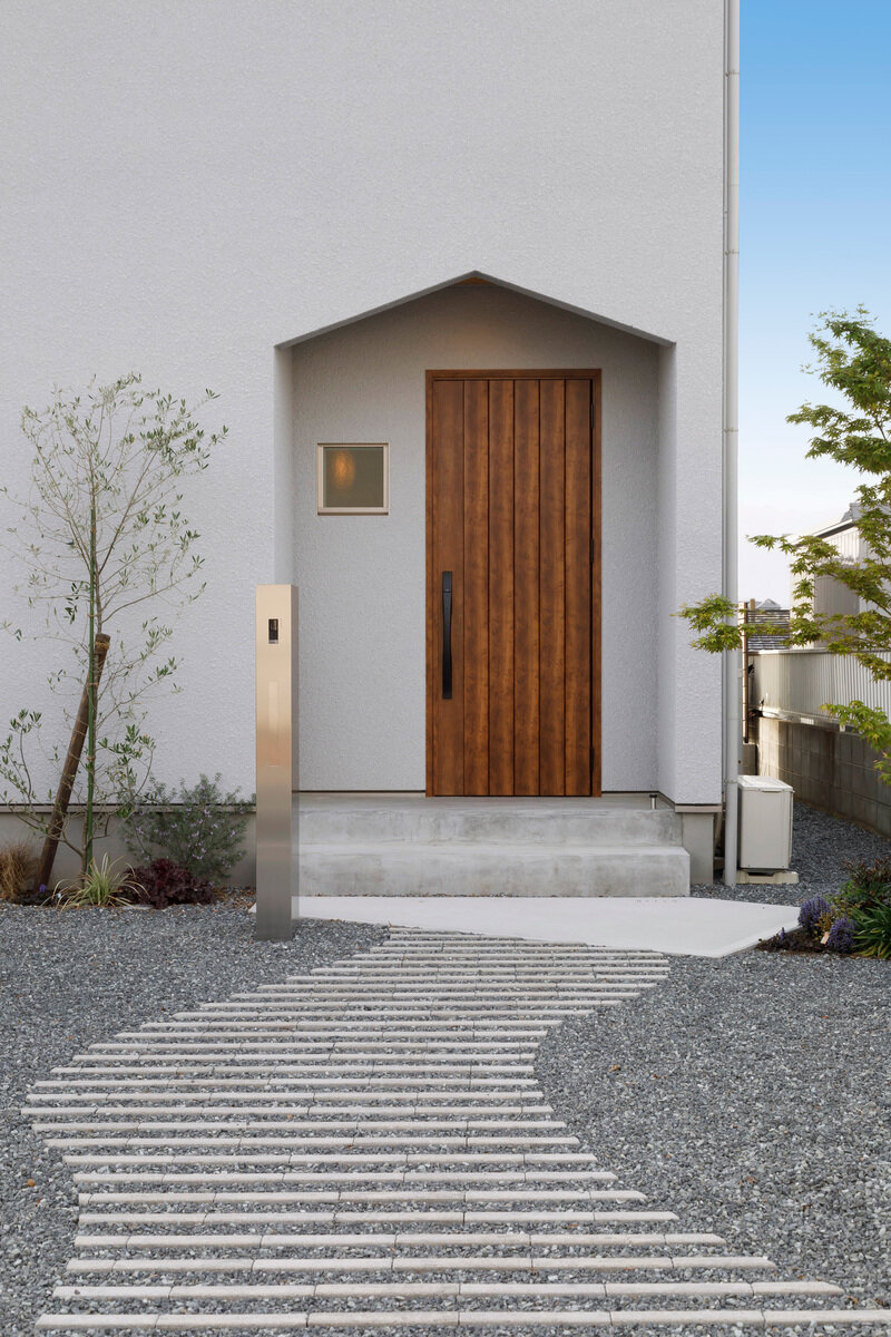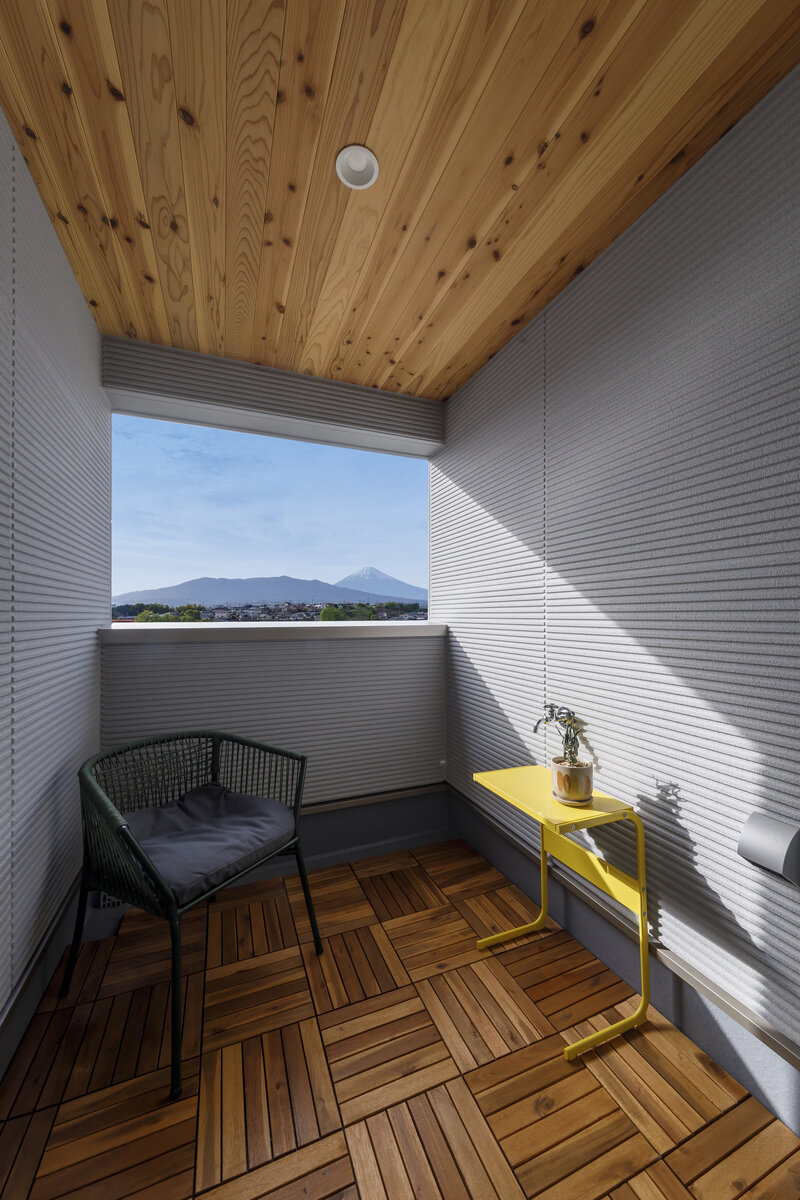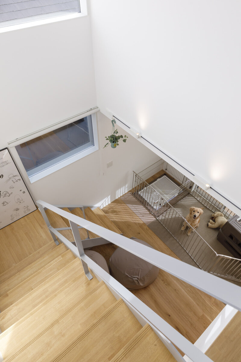 青空とのコントラストが可愛らしい三角屋根の白い外観は奥さまのいちばんの希望。一見、白に見えますが、ほんのりとグレーが入っているのがポイントです。目線が上へと抜けていく吹抜けのリビング。スケルトンの階段をグレーにしたことで空間に統一感が生まれました。グレーと白+木目でコーディネートされたダイニングキッチン。お気に入りの北欧ブランドでそろえたイニングセットが空間に彩りを与えます。中庭から光が降り注ぐLDKは、外観からは想像がつかないほどの開放感。LDKの中心に愛犬ウニちゃんのスペースをつくりました。LDKとつながるテラス。ウニちゃんがお庭で遊ぶ様子を眺めたり、チェアに腰をかけてひなたぼっこを楽しんだり。玄関ホールから洗面室、ランドリールーム、浴室へと直結する動線をもうけたことで家事の負担が減り、ご夫婦でともにくつろぐ時間が増えたそう。できるだけシンプルに仕上げつつも一面だけ壁をグレージュにすることで、空間にほどよい深みが生まれています。天井に浮かぶまんまるの照明がポイントです。爽やかな自然光が注ぐ吹き抜け空間。2階を見上げるウニちゃんの様子がなんとも愛おしいですね。ついつい長居してしまう癒しのトイレ。足元のタイルやペーパーホルダーなどお施主様の遊び心が素敵です。富士山が見える位置にしつらえた隠れ家的なインナーバルコニー。家にいながらオープンエアの風を感じることができる、とっておきの空間です。屋根と同じ三角のデザインを取り入れた玄関ポーチ。アプローチのデザインにもこだわりました。