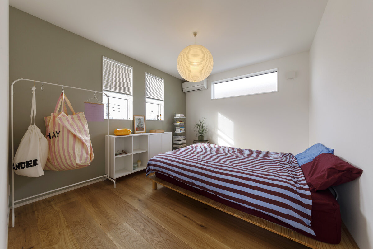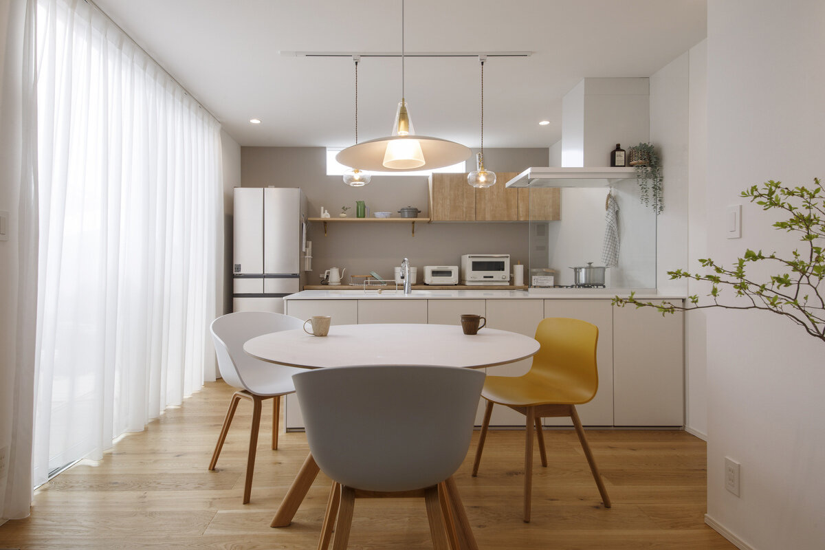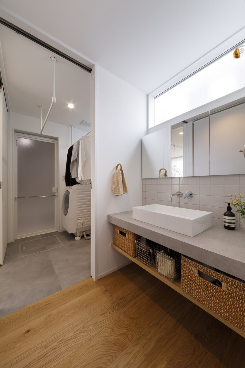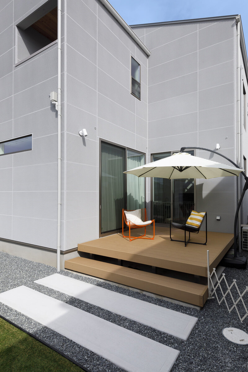 青空とのコントラストが可愛らしい三角屋根の白い外観は奥さまのいちばんの希望。一見、白に見えますが、ほんのりとグレーが入っているのがポイントです。目線が上へと抜けていく吹抜けのリビング。スケルトンの階段をグレーにしたことで空間に統一感が生まれました。グレーと白+木目でコーディネートされたダイニングキッチン。お気に入りの北欧ブランドでそろえたイニングセットが空間に彩りを与えます。中庭から光が降り注ぐLDKは、外観からは想像がつかないほどの開放感。LDKの中心に愛犬ウニちゃんのスペースをつくりました。LDKとつながるテラス。ウニちゃんがお庭で遊ぶ様子を眺めたり、チェアに腰をかけてひなたぼっこを楽しんだり。玄関ホールから洗面室、ランドリールーム、浴室へと直結する動線をもうけたことで家事の負担が減り、ご夫婦でともにくつろぐ時間が増えたそう。できるだけシンプルに仕上げつつも一面だけ壁をグレージュにすることで、空間にほどよい深みが生まれています。天井に浮かぶまんまるの照明がポイントです。爽やかな自然光が注ぐ吹き抜け空間。2階を見上げるウニちゃんの様子がなんとも愛おしいですね。ついつい長居してしまう癒しのトイレ。足元のタイルやペーパーホルダーなどお施主様の遊び心が素敵です。富士山が見える位置にしつらえた隠れ家的なインナーバルコニー。家にいながらオープンエアの風を感じることができる、とっておきの空間です。屋根と同じ三角のデザインを取り入れた玄関ポーチ。アプローチのデザインにもこだわりました。