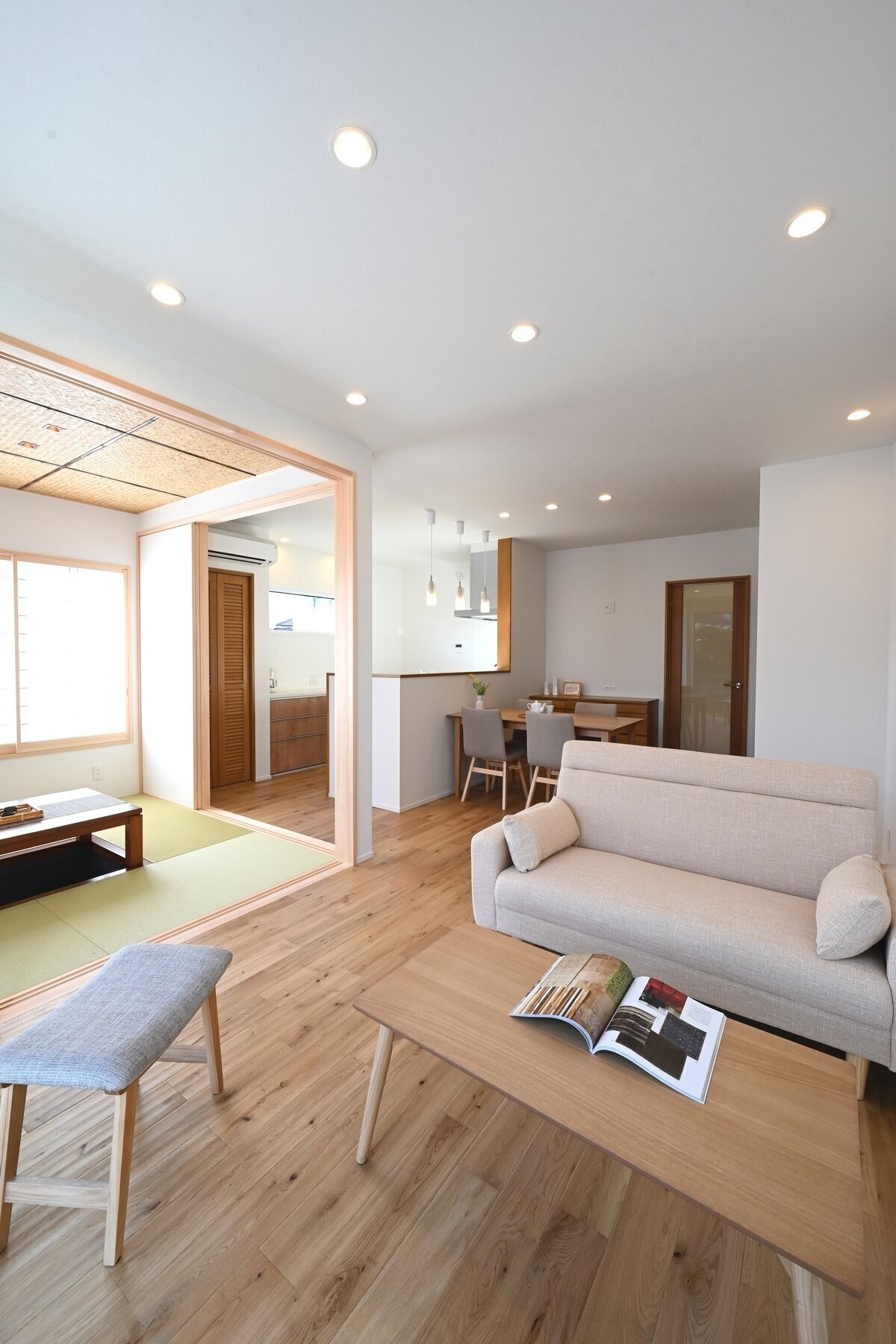 ARC style GALLERY 平屋の二世帯住宅 (完全分離型) 埼玉県 Concept 各世帯のプライバシーを確保しつつ、同じ建物で暮らすメリットを活かした、完全分離型の二世帯住宅です。親世帯は柔らかなナチュラルカラー、子世帯はモノトーンのモダンなインテリアと、世帯毎に好みを反映できるのも分離型ならでは。