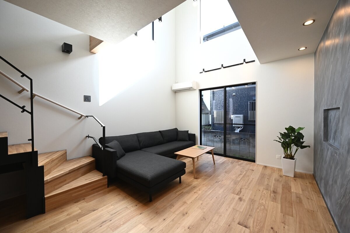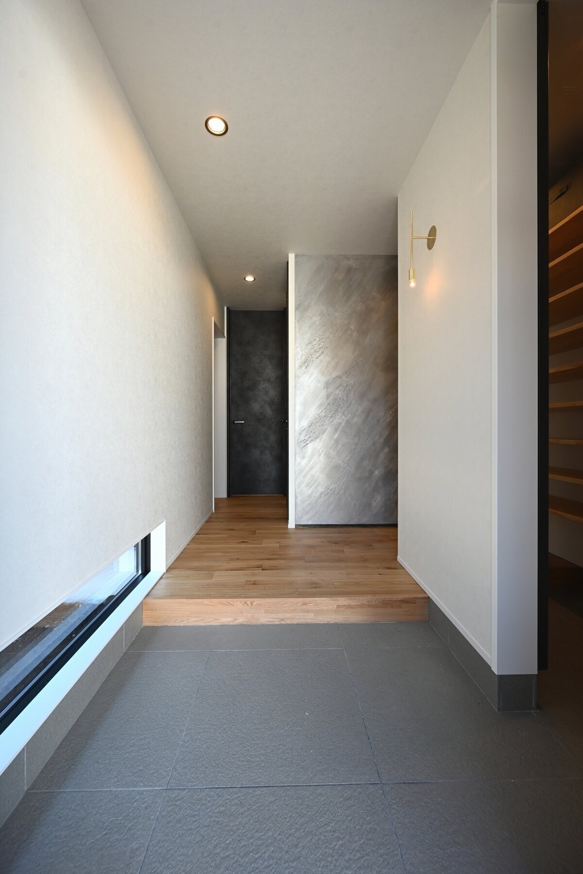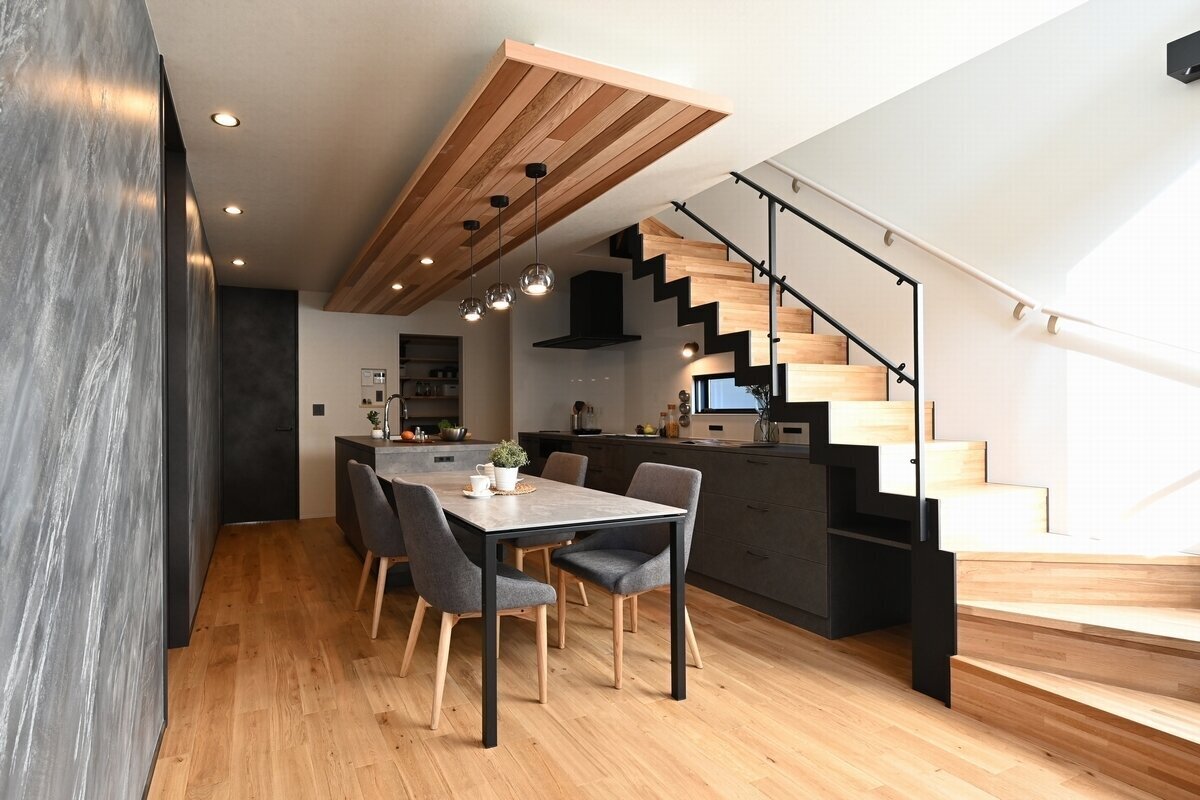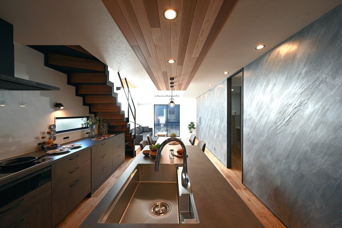 ARC style GALLERY スタイリッシュ・モダン ホテルライクな家 埼玉県 Concept 洗練されたデザインと暮らしやすさを兼ね備えた、ホテルライクなお家です。キッチン⇒ダイニング⇒リビングの縦長空間に映える板張り天井やアクセントウォール。視線と動線を奥へ奥へと導き、明るく開放的なリビングへと誘います。