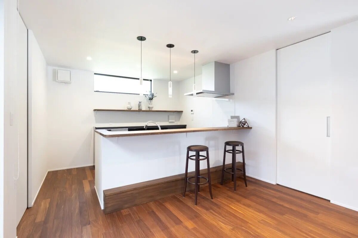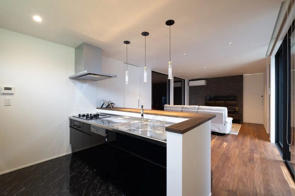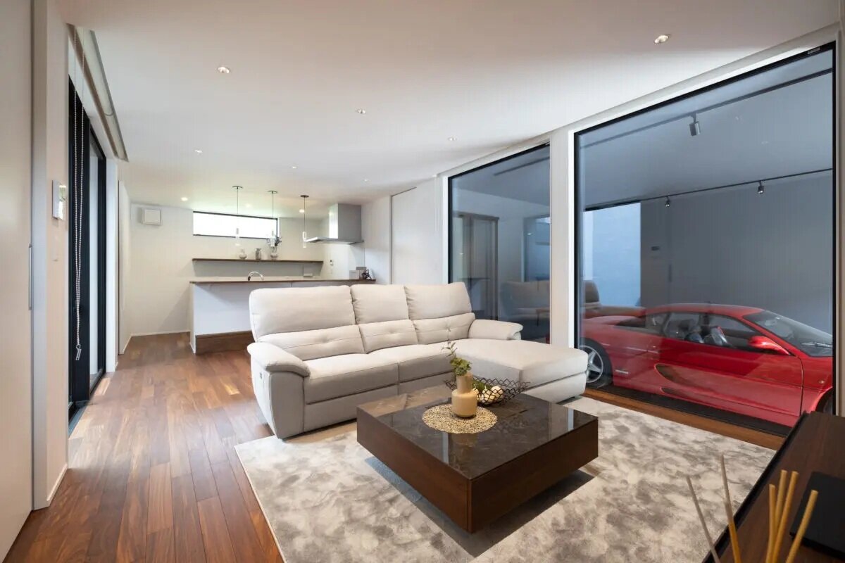 ARC style GALLERY 趣味を楽しむ男の隠れ家 群馬県 Concept 車とバイクが趣味のオーナー様からのご要望でリビングからいつでも愛車を眺められる、こだわりのガレージハウスが完成しました。車好きなオーナー様にとって夢のような空間であり、愛車を眺めながら過ごす時間が日常を贅沢にしてくれます。また、外壁には建物を丸ごと外気から遮断する「外張断熱」と、柱の間に断熱材を充填する「充填断熱」を融合した"ダブル断熱工法 DCP WALL"を採用することで、夏涼しく、冬暖かい、一年を通して心地よい暮らしを実現。機能面もデザイン面も妥協することなく、趣味を楽しむ男の隠れ家を叶えました。