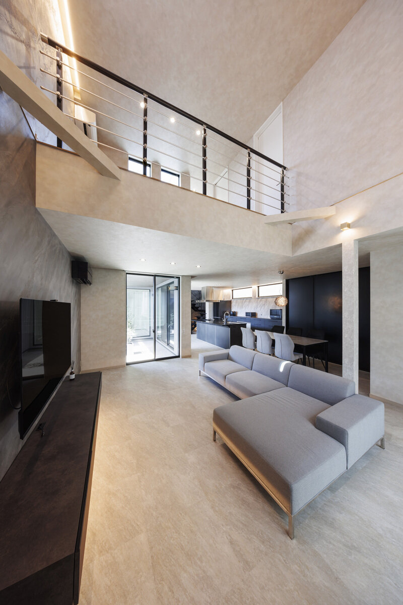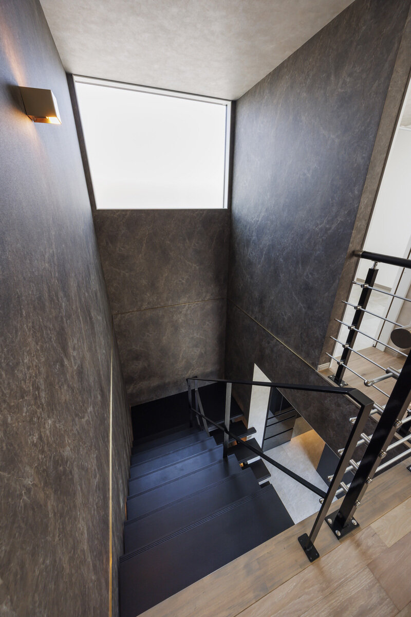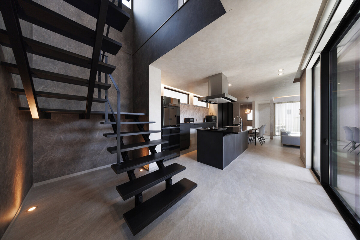 リビングには黒の鉄骨階段を設け、家族の動きが感じられる開放的な設計。