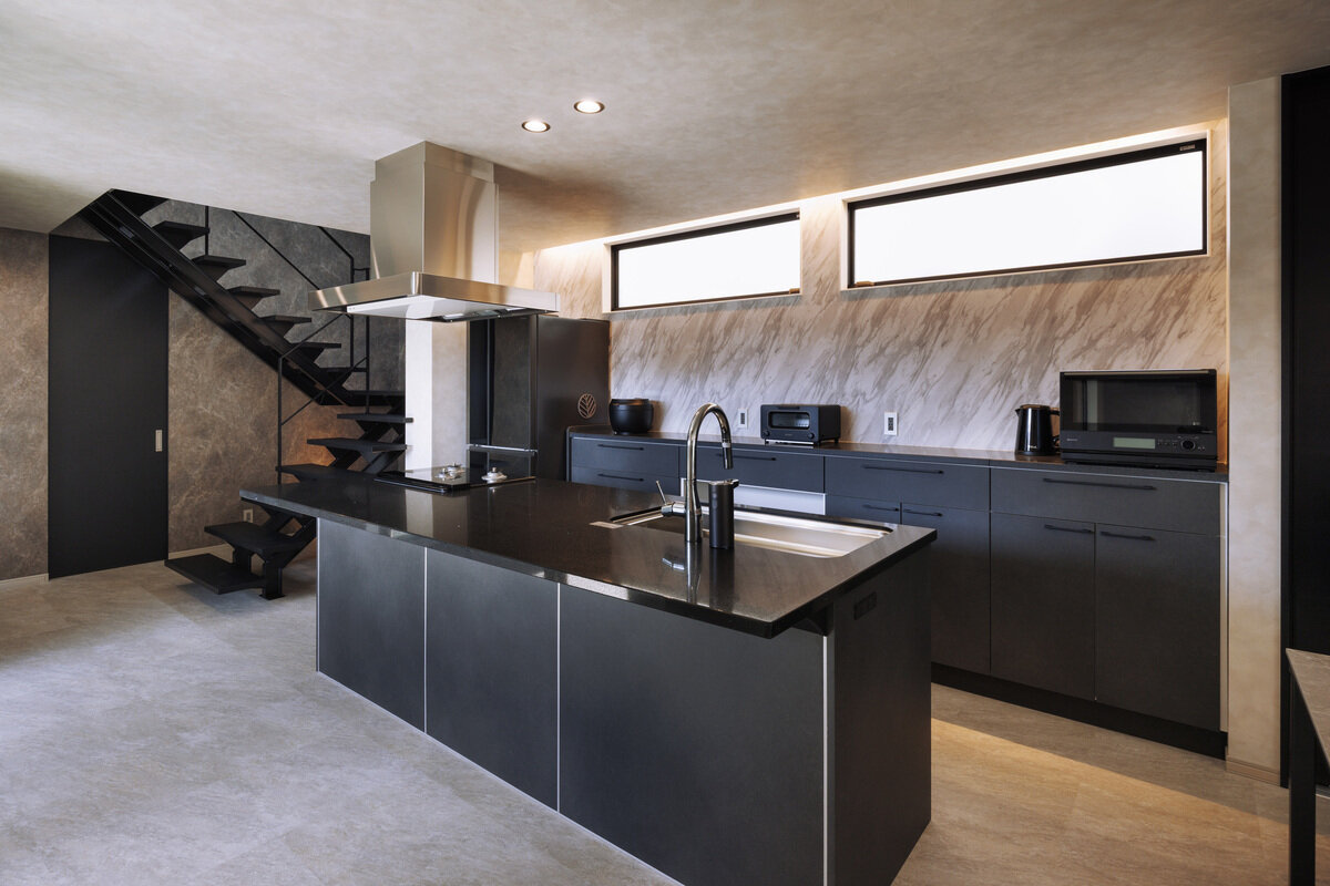 玄関にはシューズクローゼットを備え、美観と利便性を両立。白・黒・グレージュで統一されたLDKは、30畳超の広々空間。キッチンとダイニングを横並びに配置し、家族のコミュニケーションが取りやすく、パントリーは引き戸で生活感を隠せます。