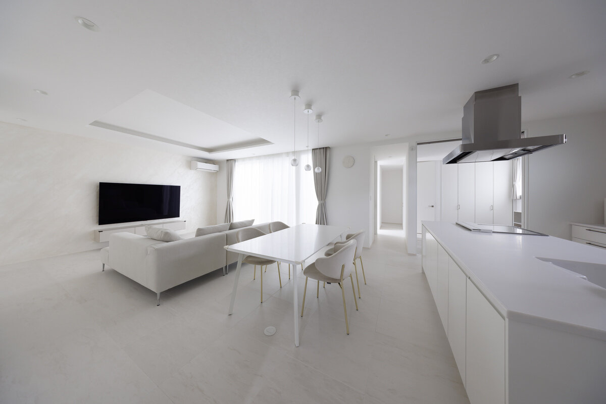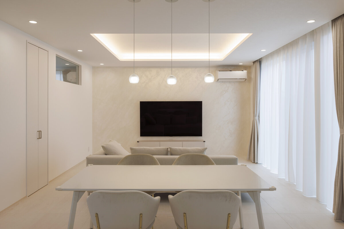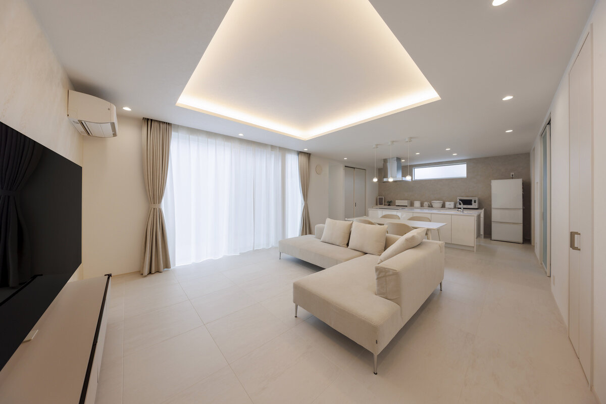 室内は装飾を抑えた開放的なLDKが中心で、折り上げ天井やハイサッシからの自然光、間接照明が心地よい空間を演出。白で統一された内装は光を反射し、より明るく広がりを感じさせます。テレビ背面にはイタリア漆喰を施し、アクセントを加えています。