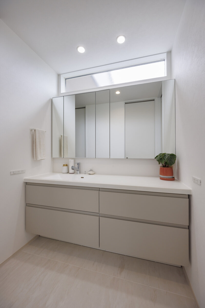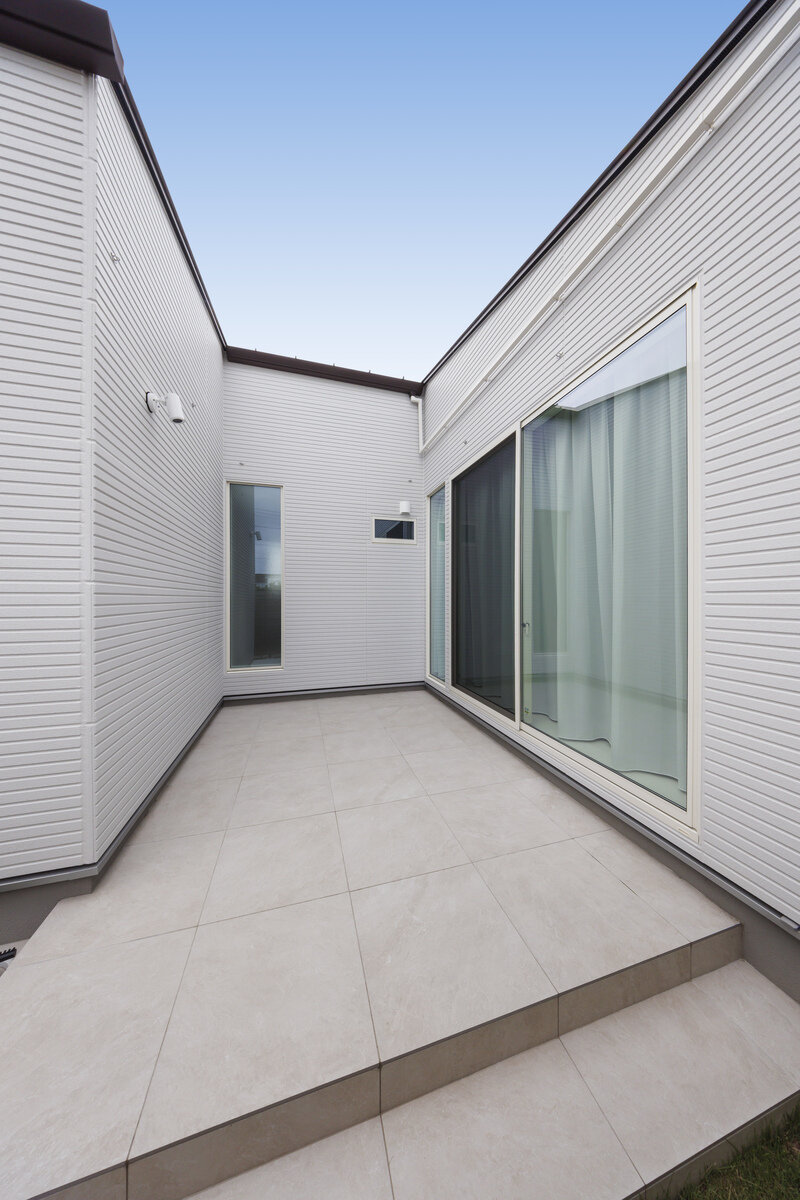 コの字型の配置により生まれた中庭は、外からの視線を気にせず楽しめるプライベート空間で、タイルデッキにより手入れも簡単です。洗面やトイレ、寝室なども統一感あるデザインでまとめられ、機能性と美しさを両立。さらに、お母様の個室やサロンスペースも備え、家族それぞれの暮らしに寄り添った設計となっています。