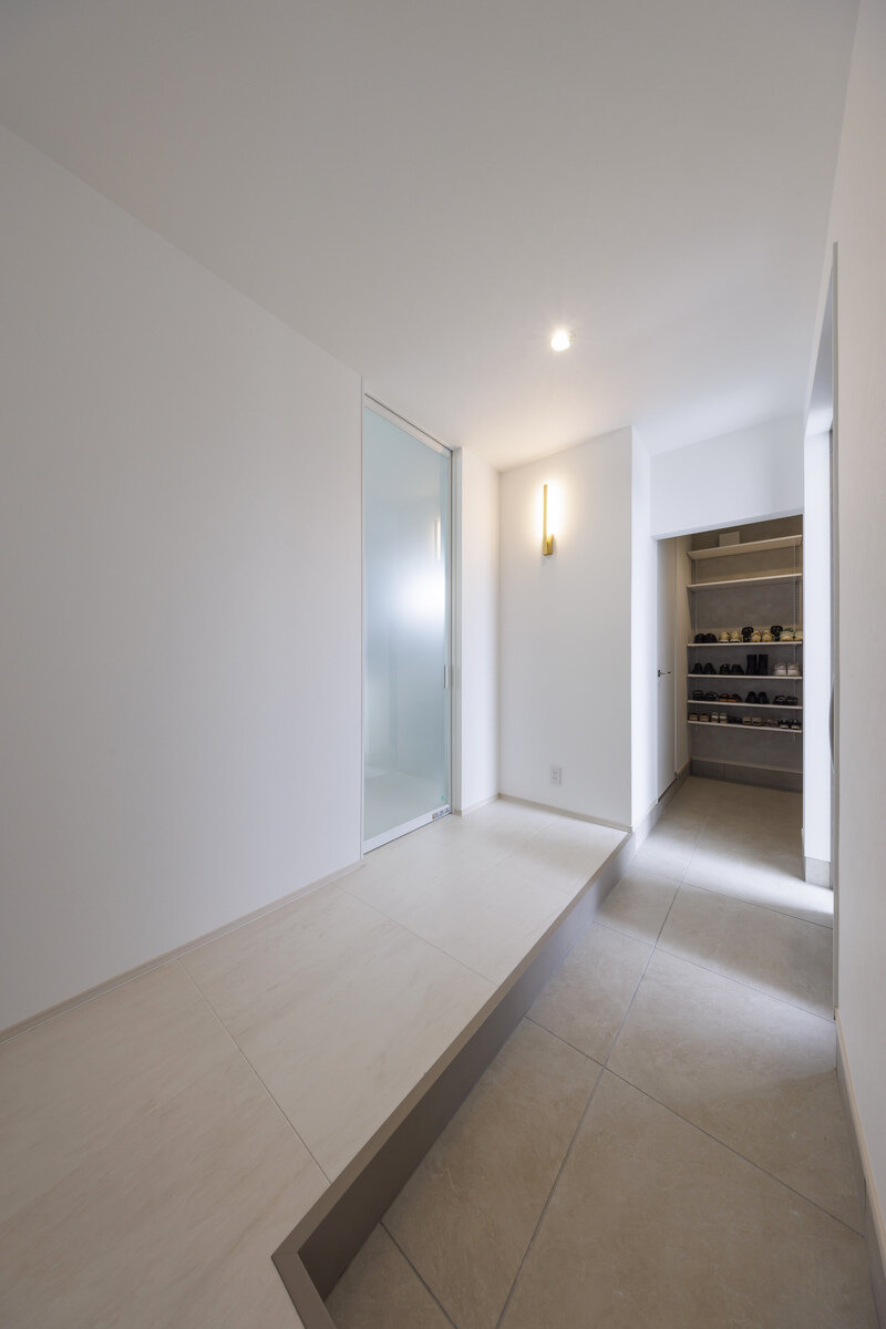 南北に長い敷地に建てられたT様邸は、白とライトグレーのALC外壁が映えるスタイリッシュな平屋で、シンプルながら細部にまでこだわりが感じられる住まいです。エントランスには大容量のシューズクローゼットを備え、空間の美しさを保ちつつ、真鍮ブラケットなど照明にもセンスが光ります。
