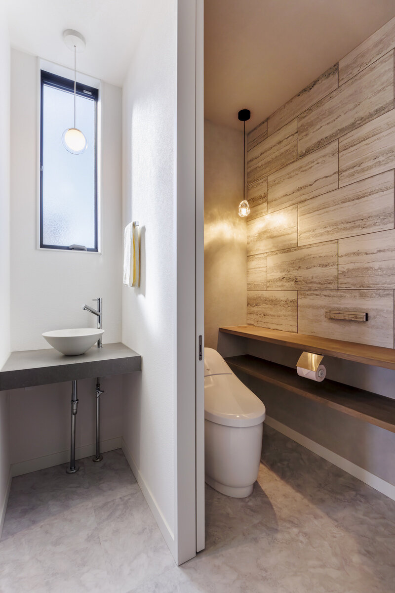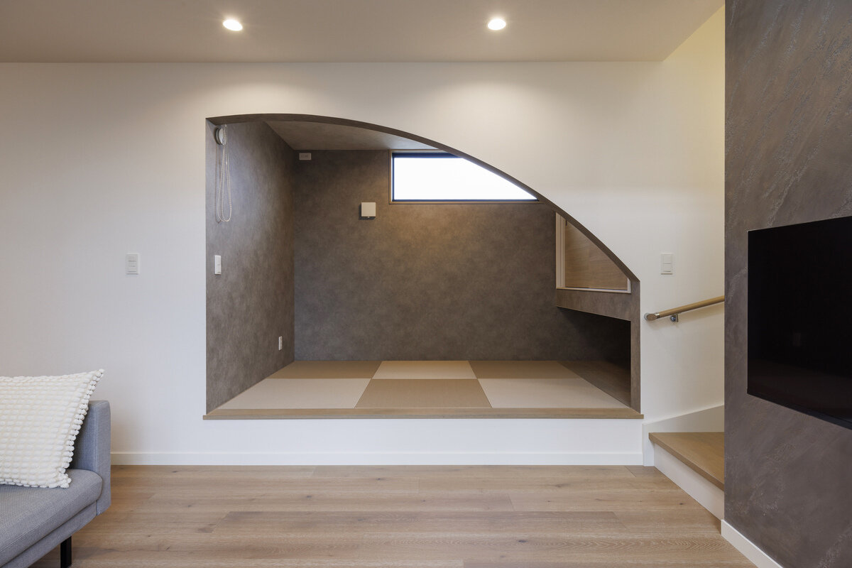 リビングにはアーチ壁が印象的な小上がり和室を併設し、家族の気配を感じられる安心感と来客対応の柔軟性を両立。さらに、水回りは一直線に配置した「神動線」により家事負担を軽減し、ランドリールームの充実した設備も暮らしやすさを支えています。主寝室や書斎など各空間も居心地と機能性に配慮され、家族それぞれが快適に過ごせる住まいとなっています。