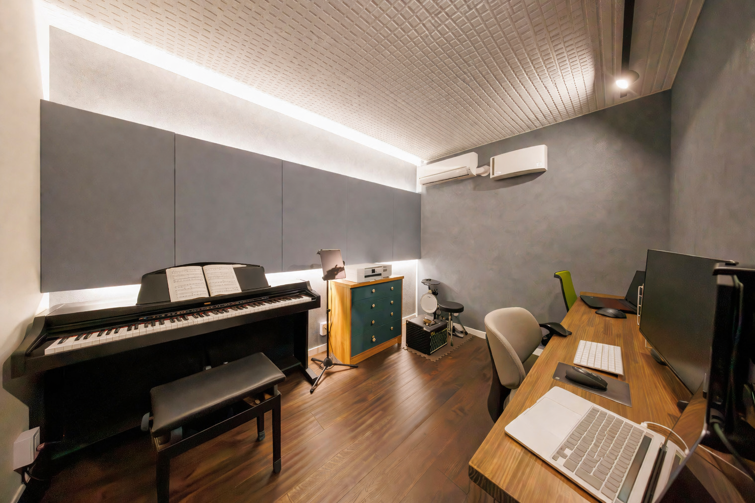 さらに、防音性能にこだわった6畳の音楽ルームも備え、ピアノやドラムの演奏も気兼ねなく楽しめる、機能性とデザイン性を兼ね備えた住まいです。