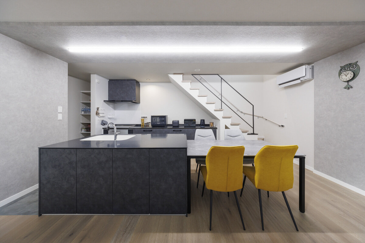 室内はダイナミックな吹き抜けのあるリビングが広がり、ソファを壁付けにすることでより開放的な空間を実現。吹き抜けまで伸びるユーロスタッコの壁面と、シンメトリーに配置された間接照明が美しい陰影を演出します。中庭と吹き抜けからたっぷりと光が差し込むLDKは、外からの視線を気にせずくつろげる心地よい空間に。中庭はガレージともつながり、多彩な使い方ができるプライベートガーデンとなっています。
