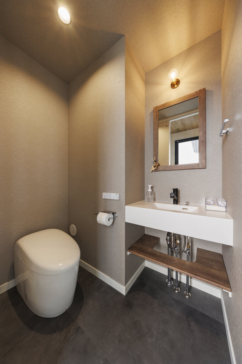 サニタリーは上下の間接照明が映えるホテルライクなデザインで、ワイドな洗面とメイクスペースを確保。脱衣室兼ランドリールームと分けることで、家族が入浴中でも気兼ねなく使えるよう配慮されています。Ⅱ型のセパレートキッチンは、コンパクトながら効率的な動線で家事のしやすさを実現。トイレには手洗いスペースを設け、グレーのクロスとウッドの組み合わせで落ち着いた印象に仕上げました。