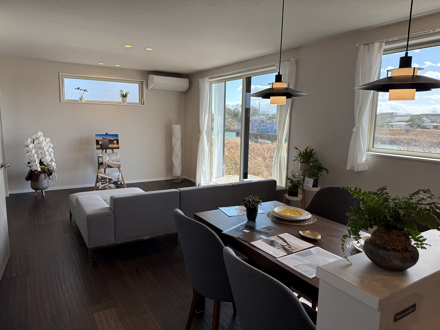 しあわせ不動産様 宮崎市佐土原モデルハウス 宮崎県宮崎市佐土原町 美しさと快適さが調和する、南向きの平屋。インナーガレージには、六角形のLEDハニカムライトが配置され、愛車やバイクを美しく照らし、近未来的な雰囲気を演出。ガレージはただの保管場所ではなく、魅せる空間に変わります。大きな窓から自然光がたっぷり差し込み、明るく開放的。太陽光発電でエコで快適な暮らしを実現します。ワンフロアで動線がスムーズ、毎日がより快適に。